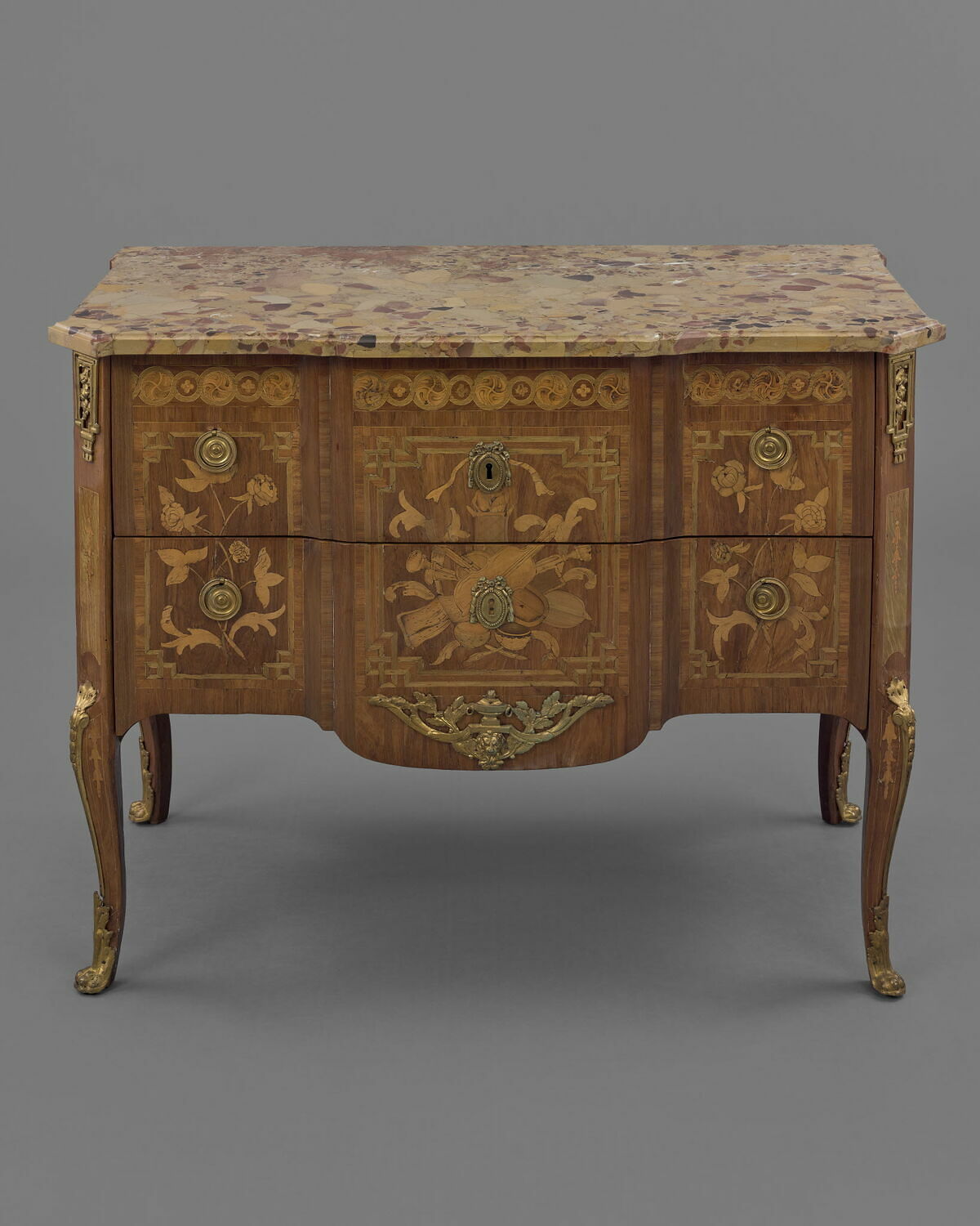 Commode de marqueterie à deux tiroirs, décorée de trois panneaux verticaux ornés, à droite et à gauche, de fleurs, au centre d'instruments de musique ; entrée de serrure, poignées, chutes et sabots de bronze doré.