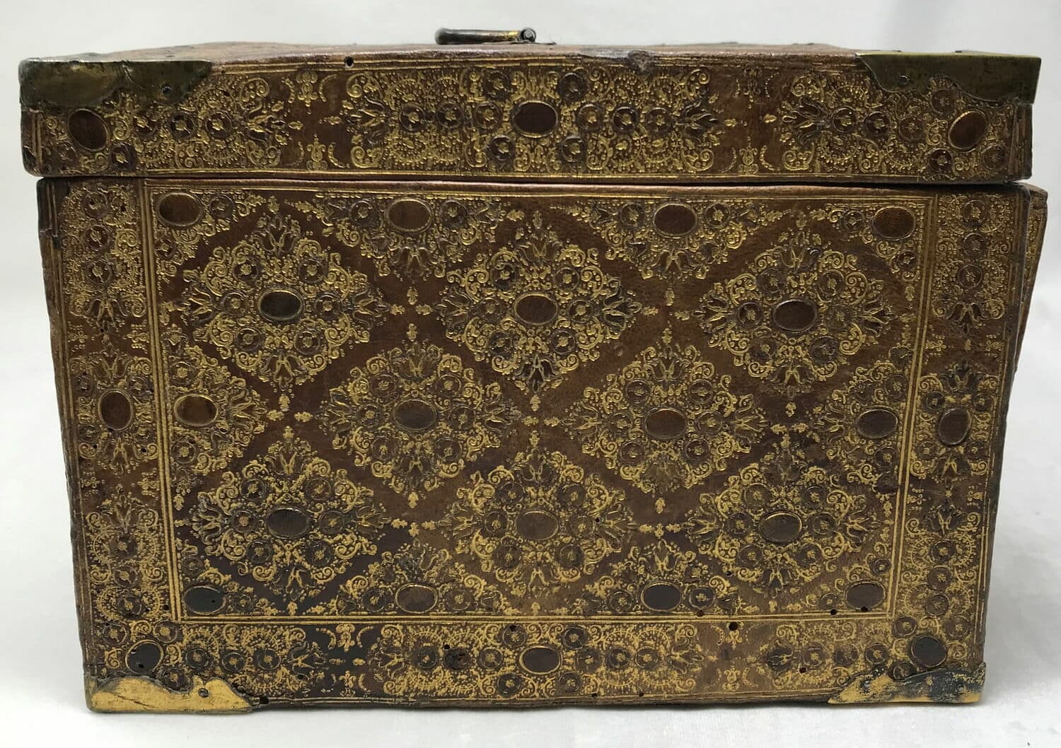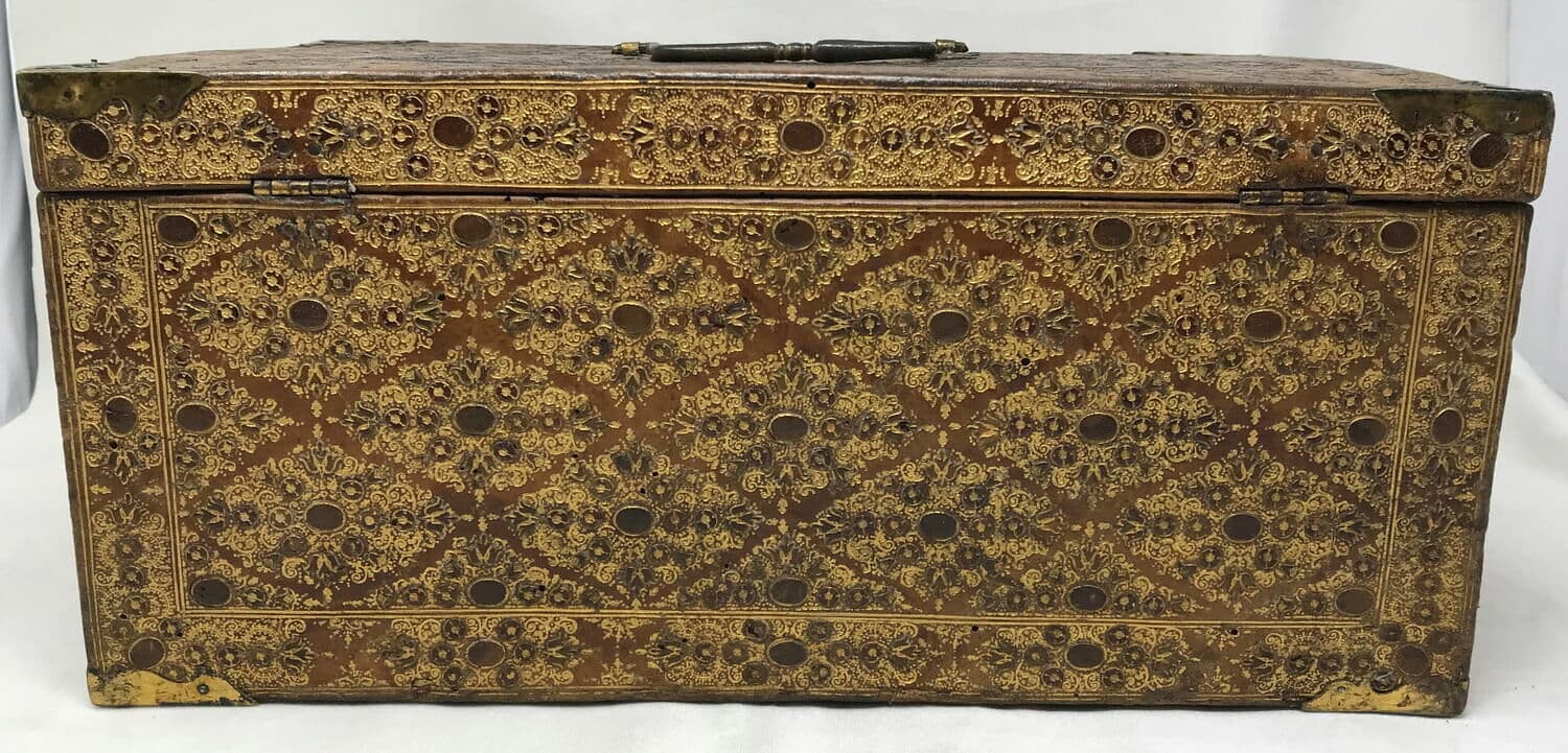Cassette rectangulaire de cuir havane décorée de motifs géométriques dorés disposés en losanges ; l'abattant découvre six tiroirs dont deux secrets.