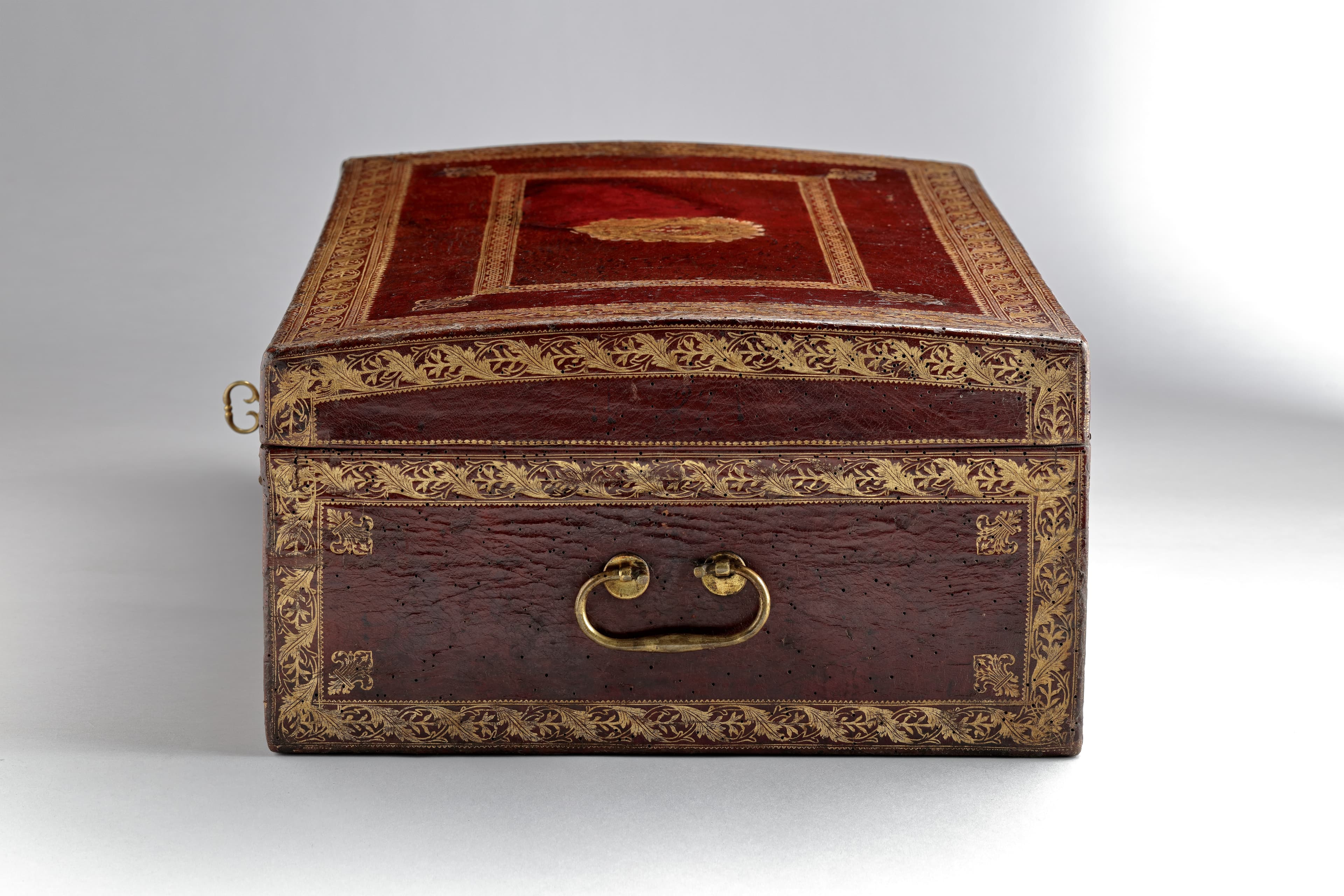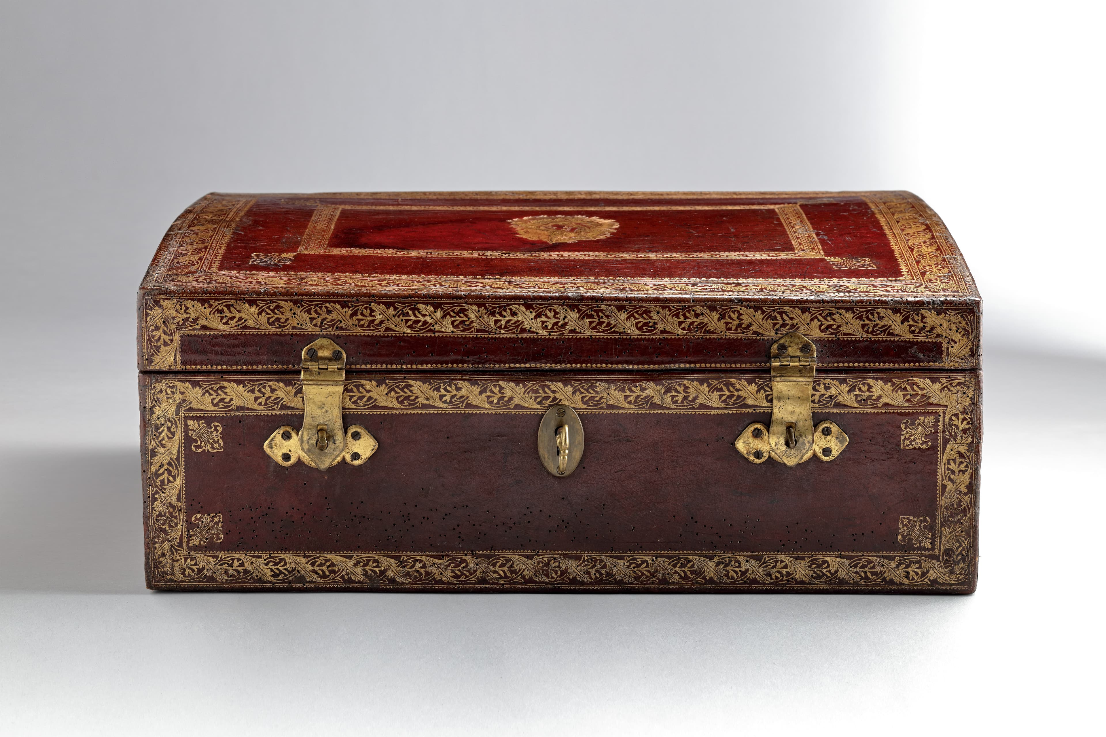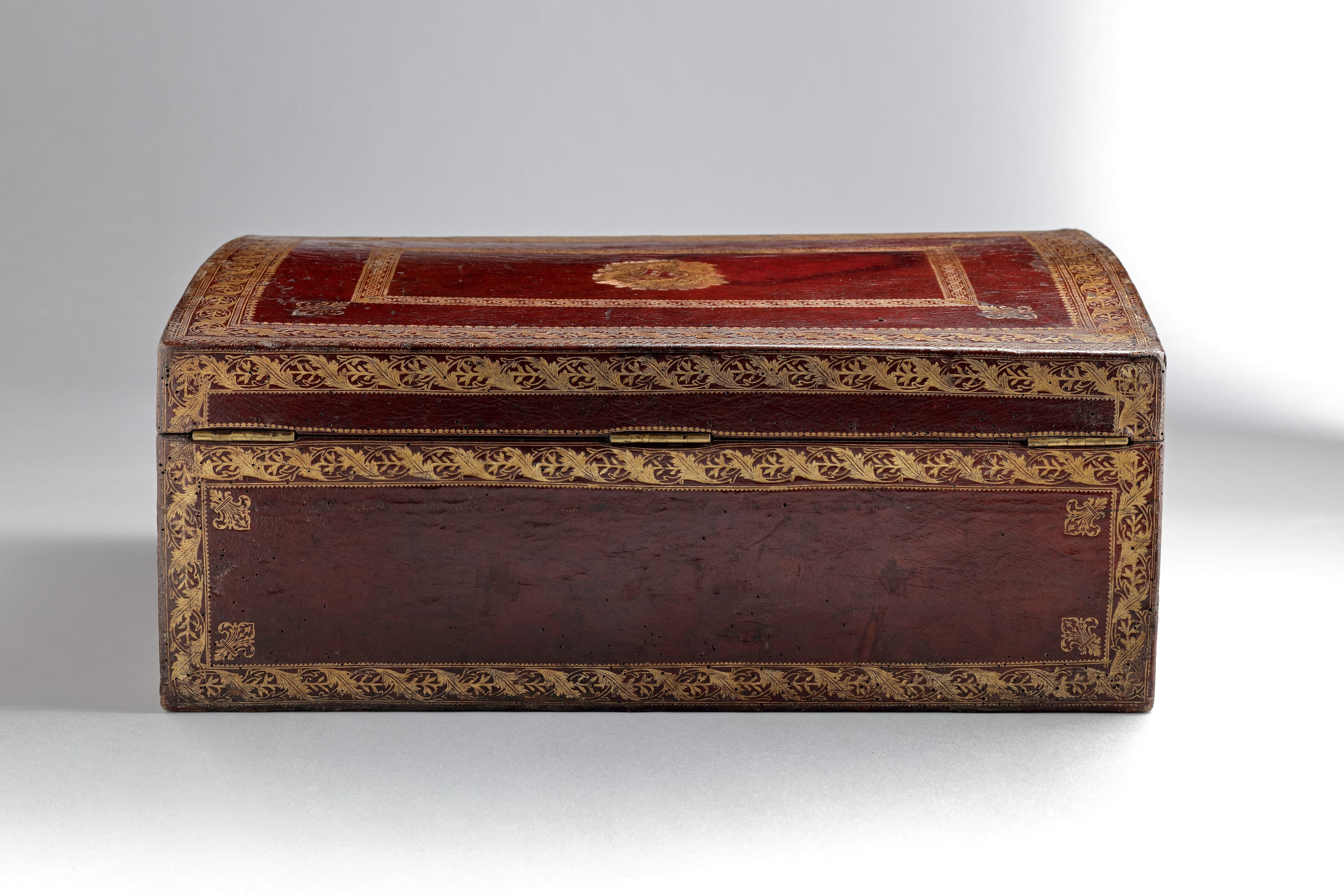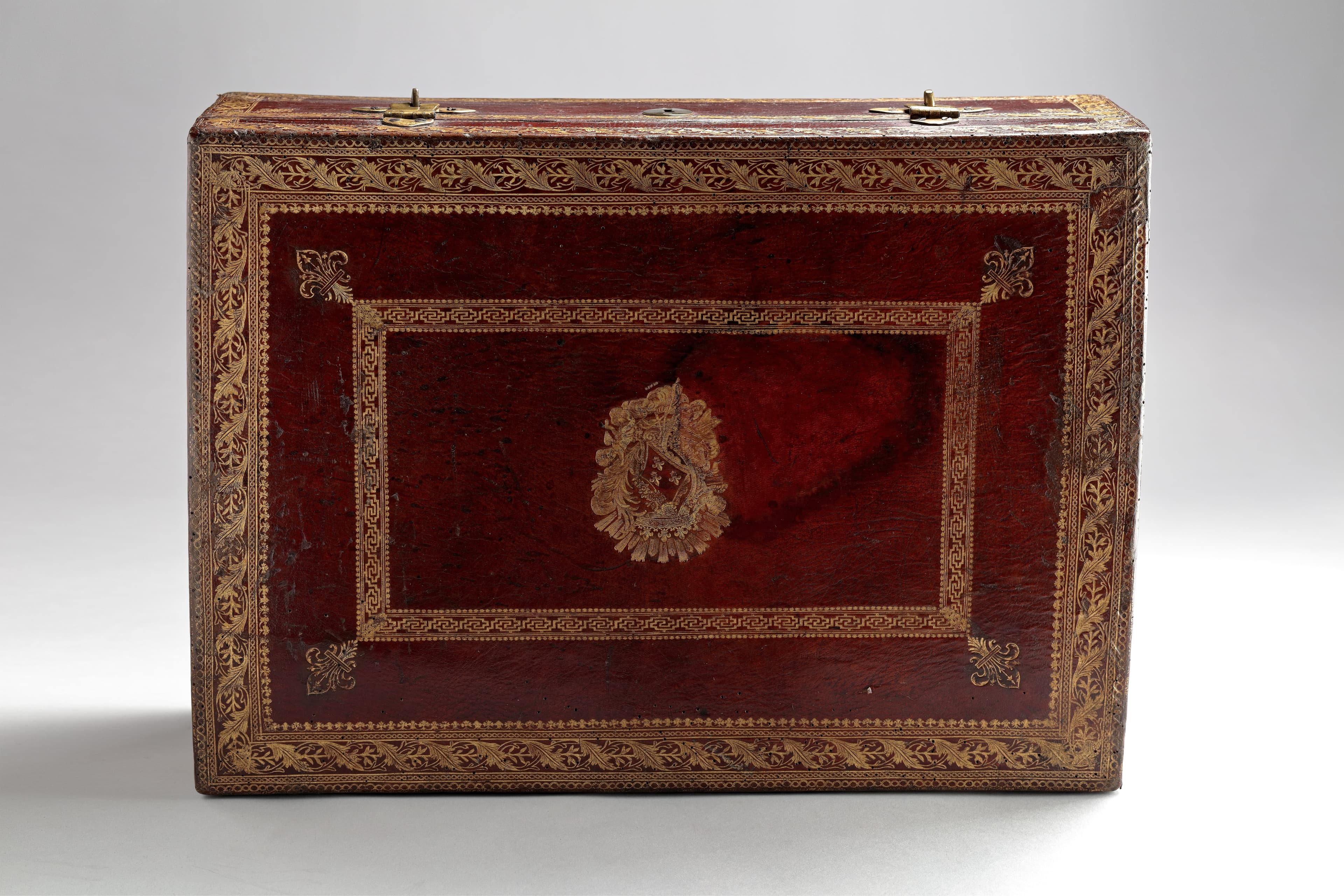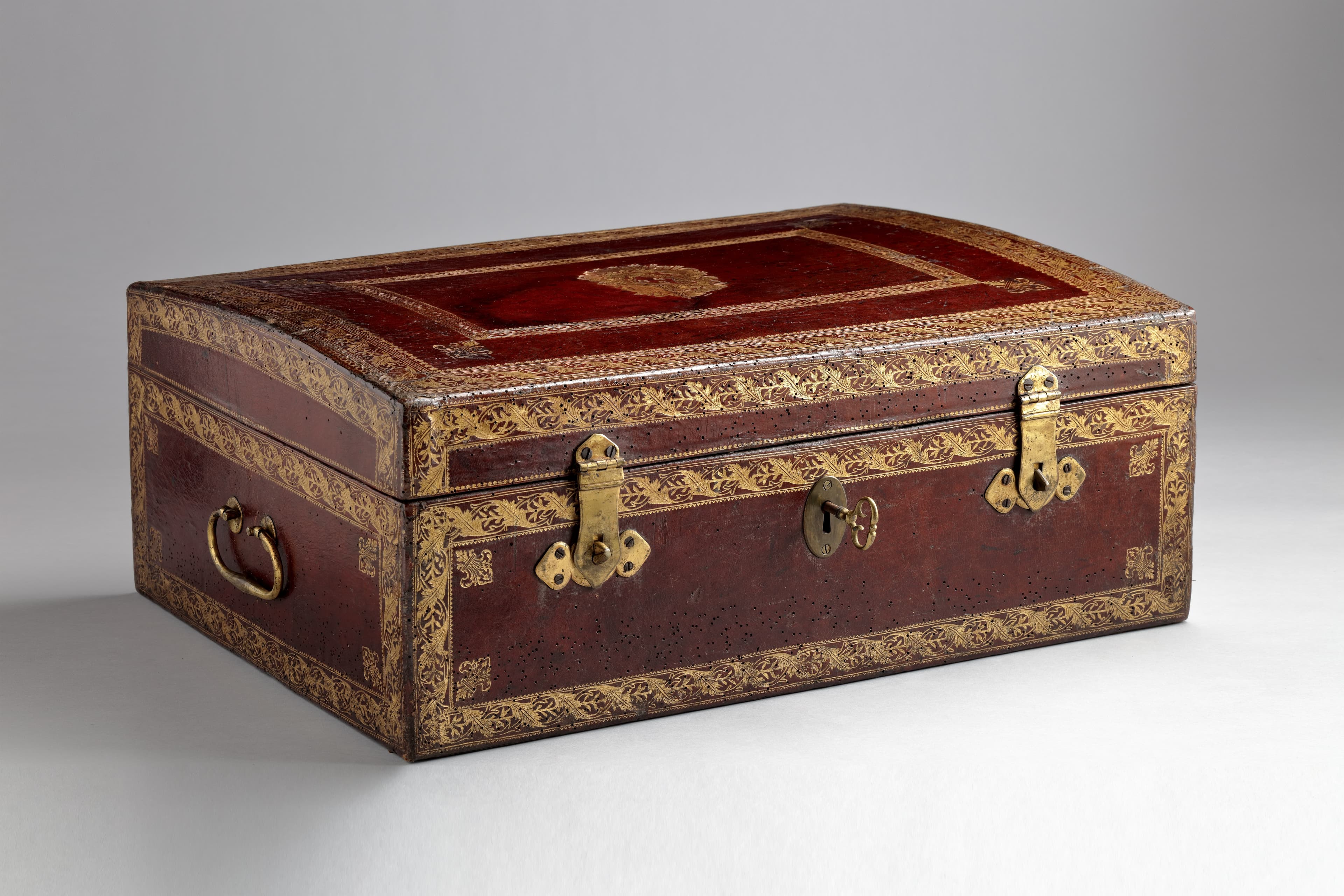 Coffre de voyage de maroquin rouge décoré de rinceaux et de motifs géométriques dorés ; le couvercle, légèrement bombé, porte en son centre les armes d'une fille de France que soutiennent deux amours.