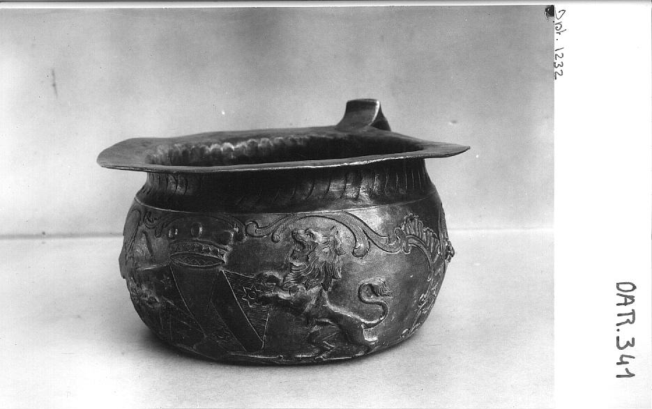 Pot de chambre d'étain à panse ventrue et anse en console, décoré de deux écus accolés surmontés d'une couronne de baron et supportés par un lion et un aigle ; réserves de rocailles et de fleurs en reliefs.