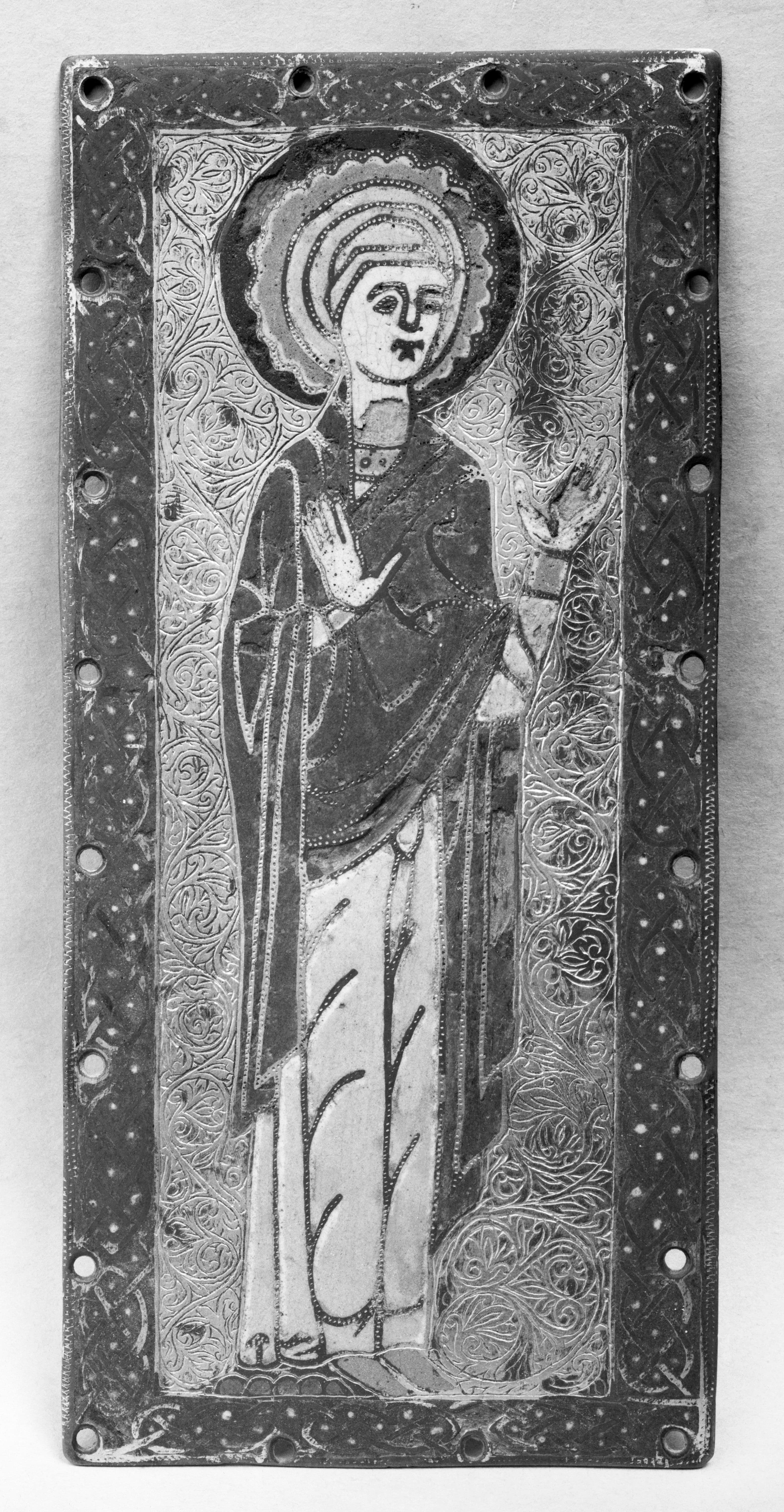 Plaque rectangulaire de cuivre doré, champlevé et émaillé représentant la Vierge debout, vêtue d'une tunique émaillée bleu-clair et d'un manteau bleu-lapis ; nimbe bleu lapis, vert et jaune, carnation blanche, fond vermiculé et doré.