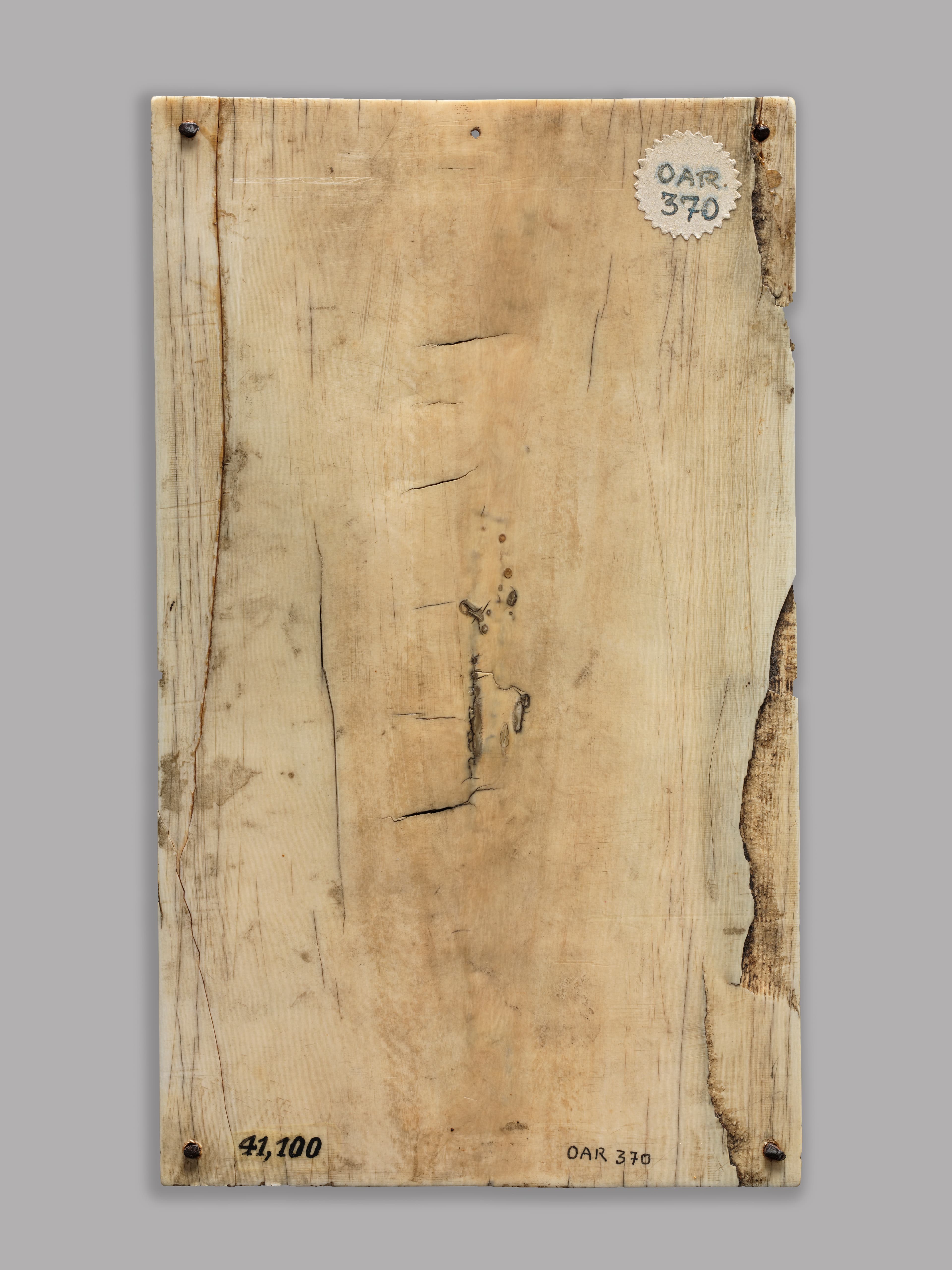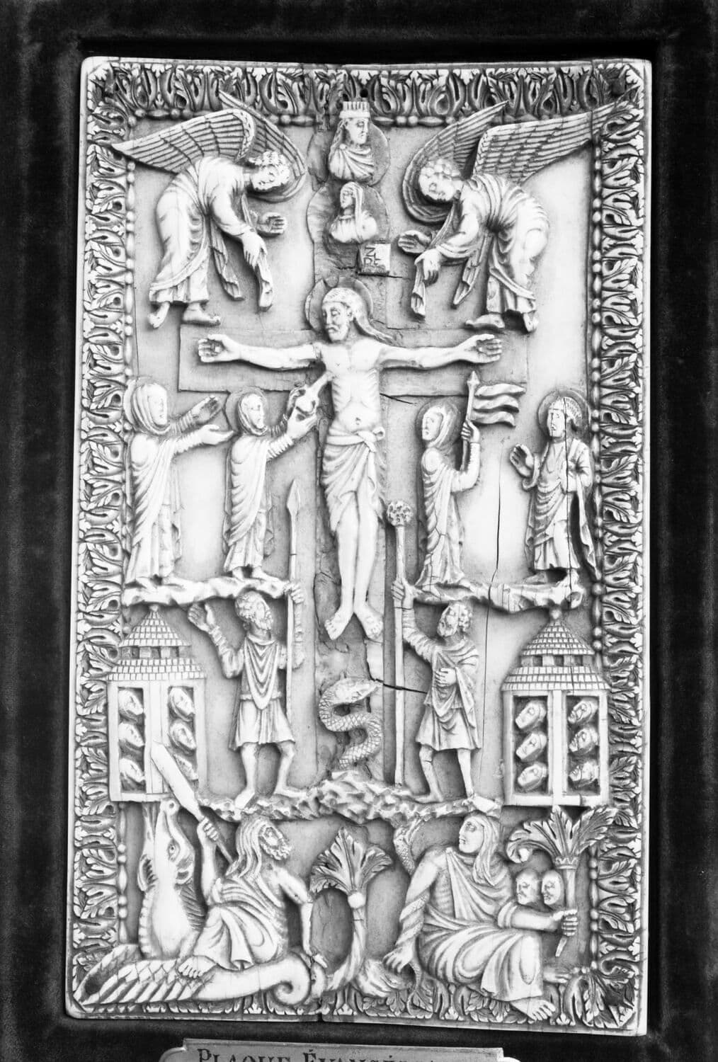 Ce relief, dont la qualité peut faire illusion, est une imitation moderne de la plaque carolingienne du Victoria and Albert Museum de Londres, qui proviendrait de la reliure de Gandersheim (inv. 251:1, 2-1867), plaque détériorée, restaurée puis dé-restaurée. La confrontation des deux ivoires à Londres en 1974 a confirmé cette hypothèse.