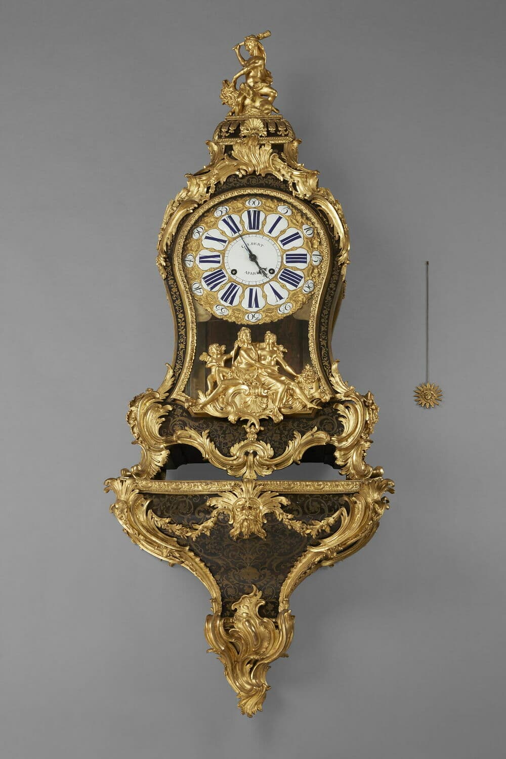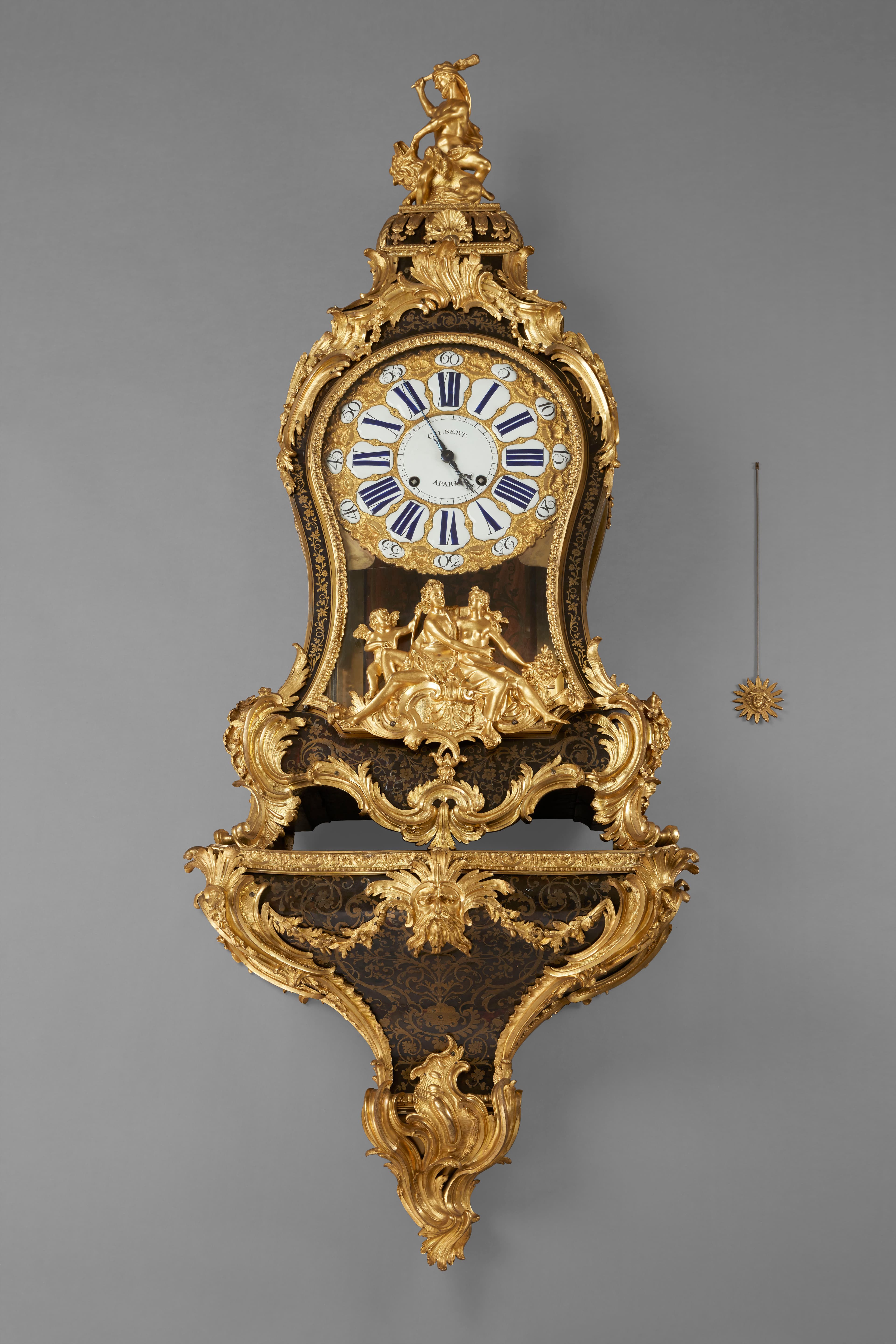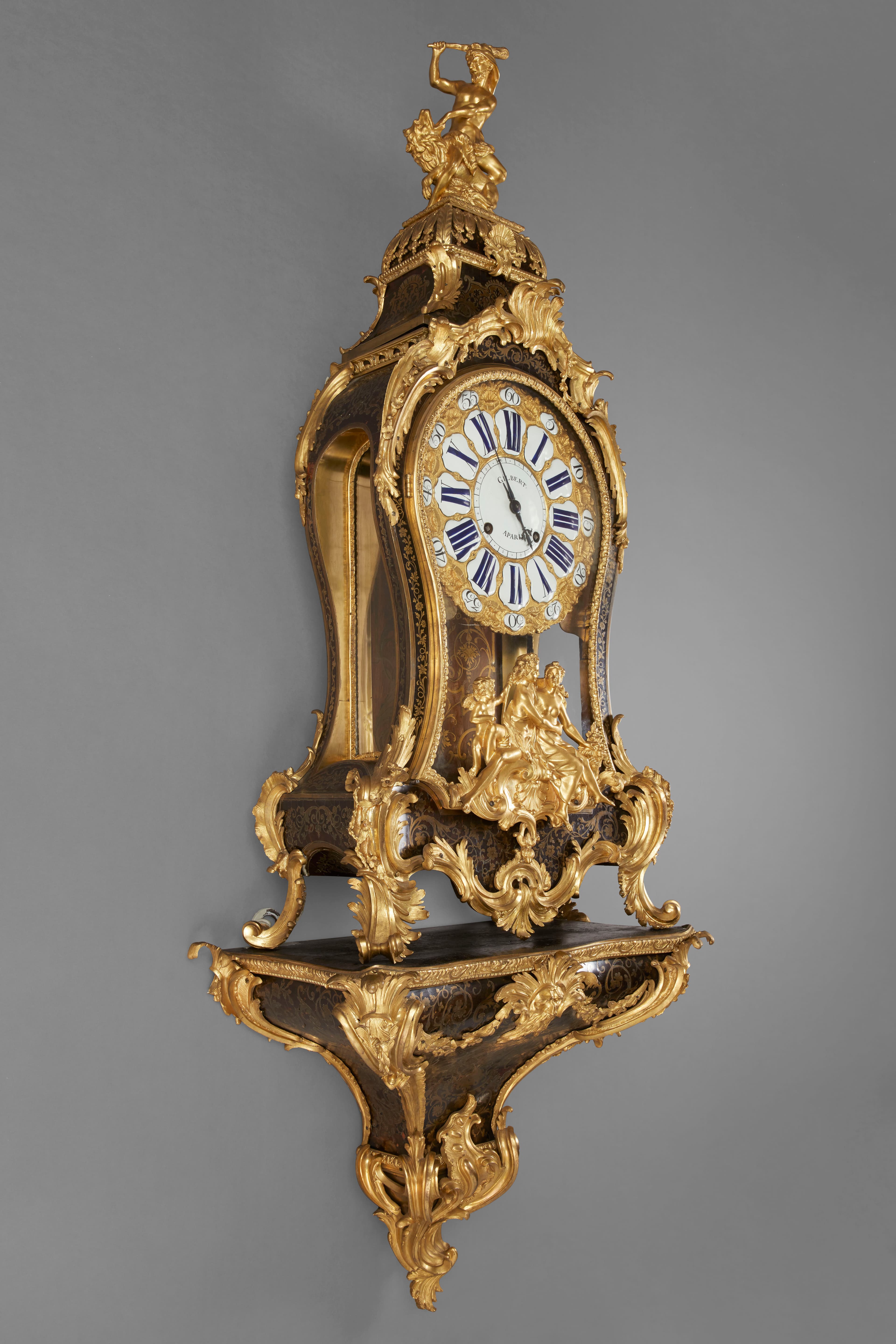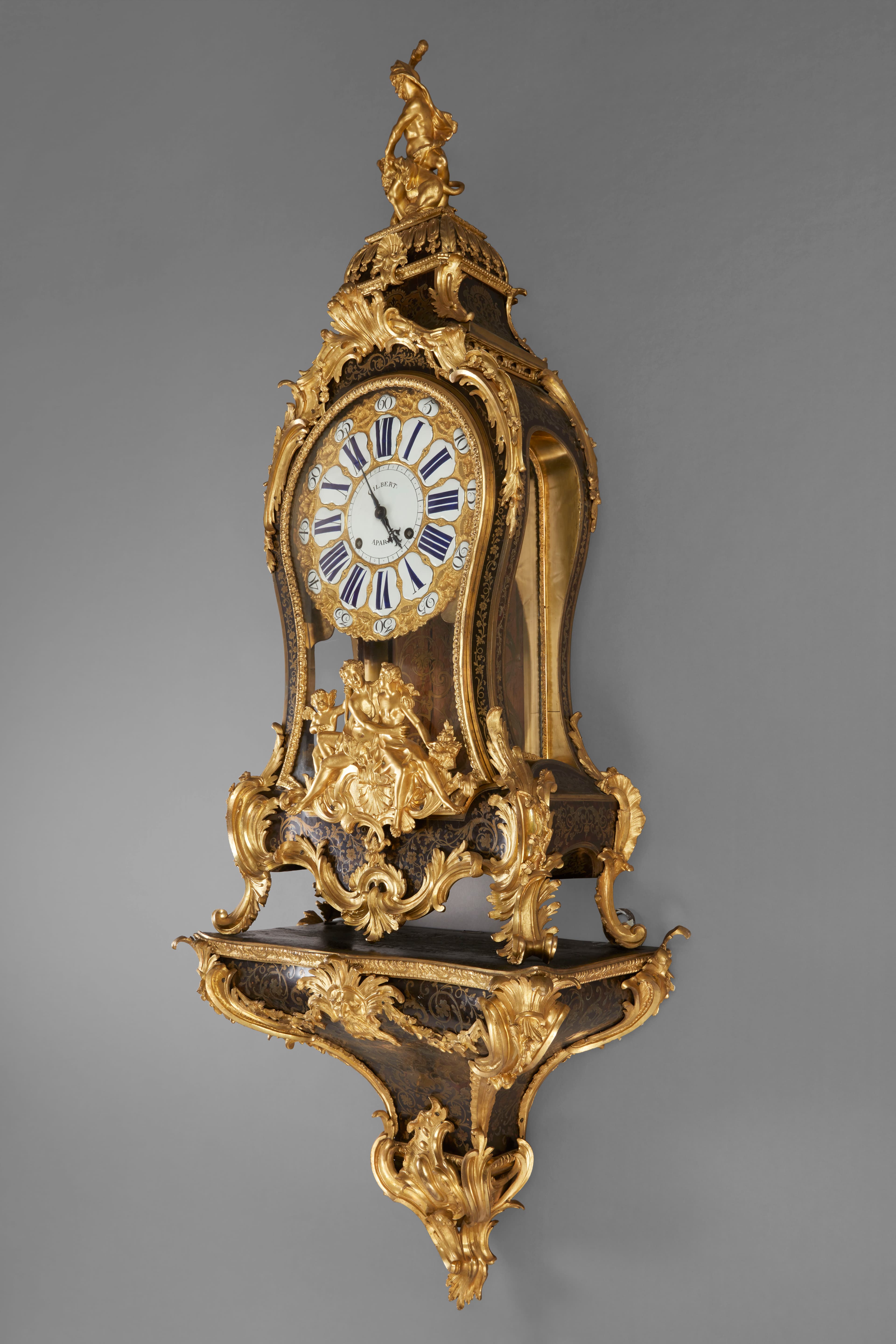 Grand cartel en marqueterie de cuivre sur fond d'écaille brune avec son support de même nature ; le cadran circulaire, de cuivre doré avec plaques d'émail, est signé "GILBERT A PARIS" ; couronnement de bronze doré : Hercule et le Lion de Némée ; à la partie inférieure, grande applique de bronze doré : Hercule et Omphale (?)