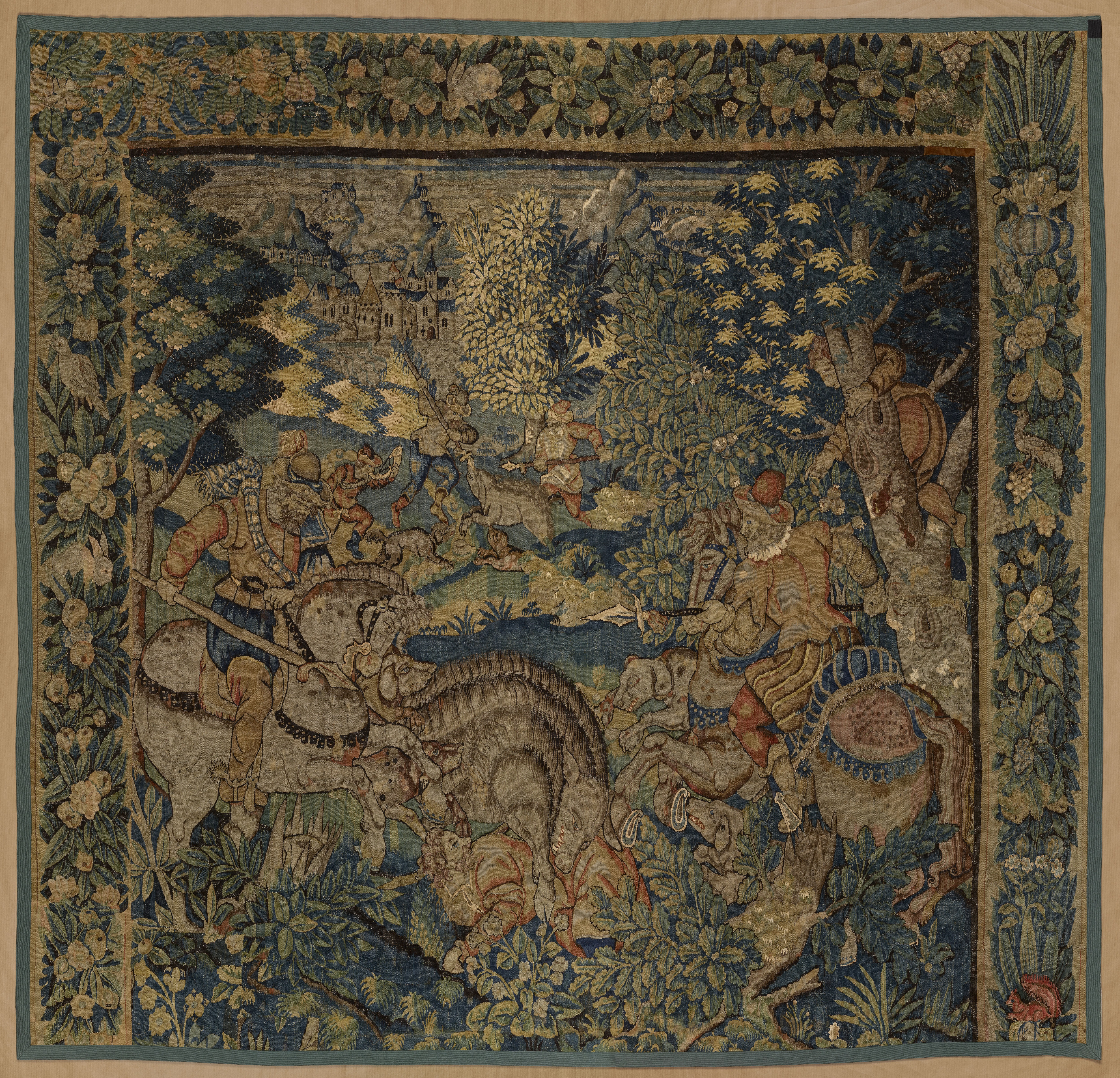 Tapisserie à trame assez grossière représentant un paysage de forêt avec au fond un château. Deux personnages à cheval et 3 autres à pied chassant le sanglier ; un autre personnage, à droite, est grimpé dans un arbre. Bordure (sauf en bas) à fruits, feuilles et oiseaux.