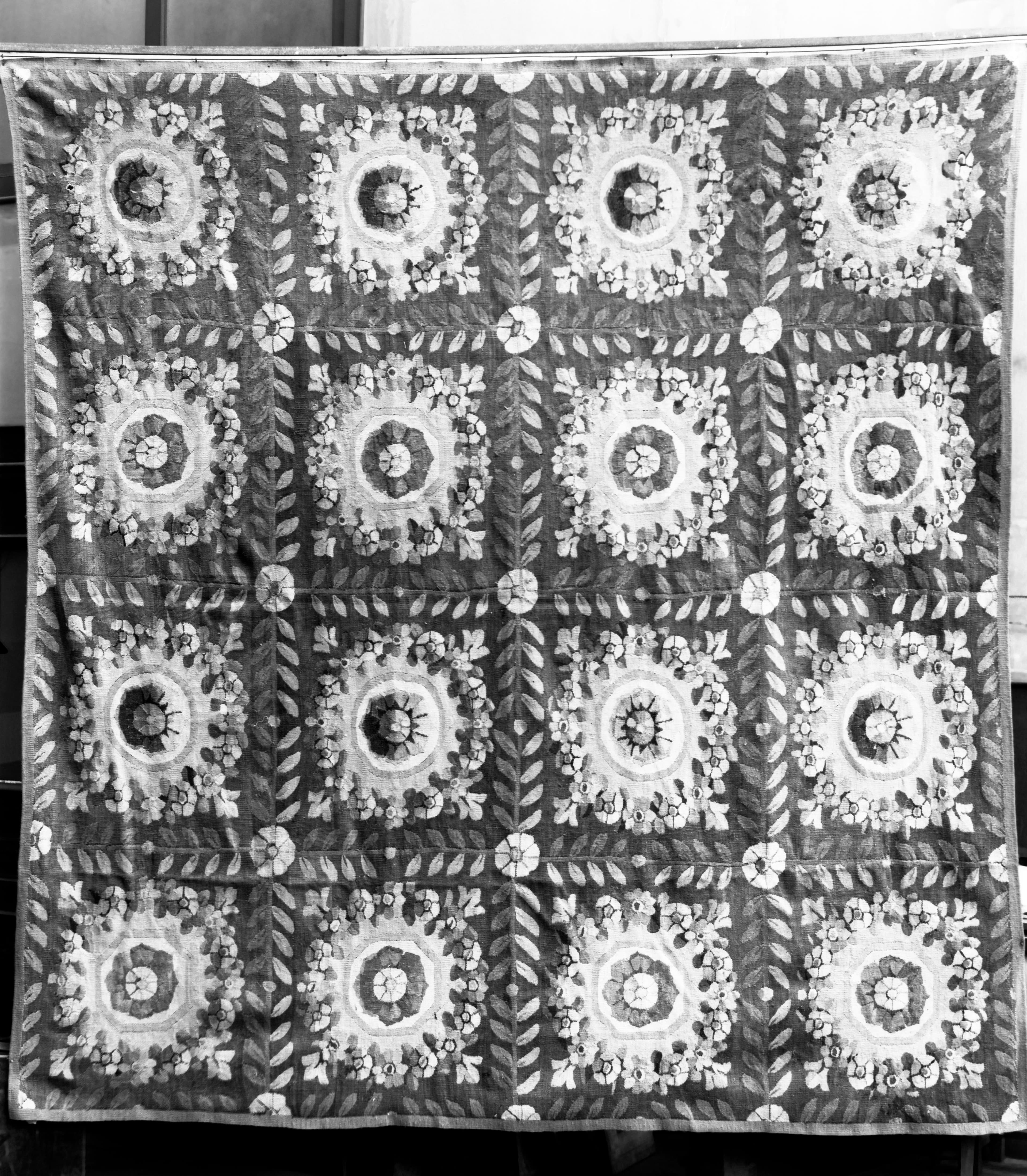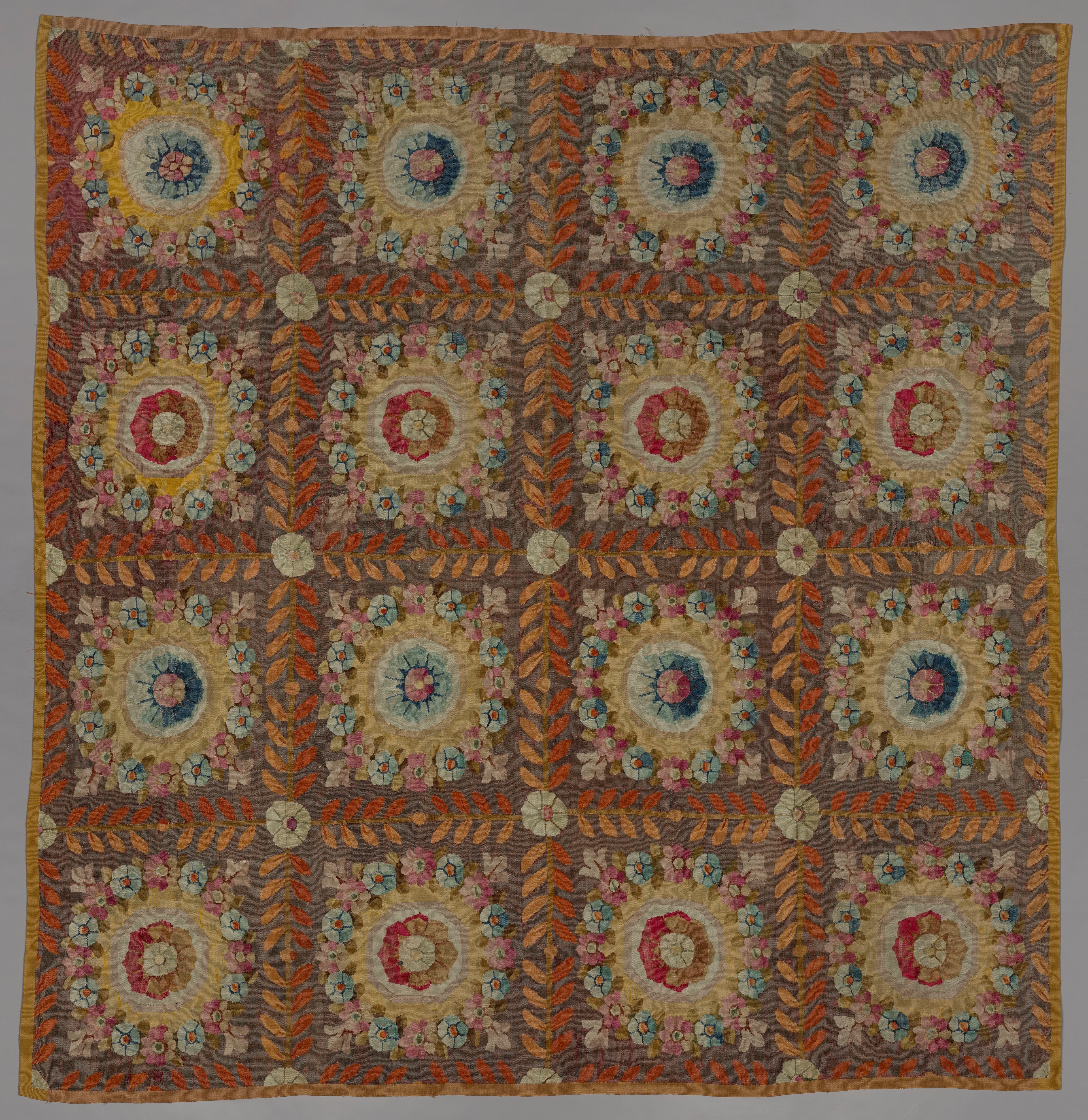 Tapis à fond violacé ; bleu, vert, rouge, orange. Composé de 16 compartiments séparés par des tiges de feuillages ornées de rosaces à leur intersection. Dans chaque compartiment une grande rosace à bordure de fleurs.