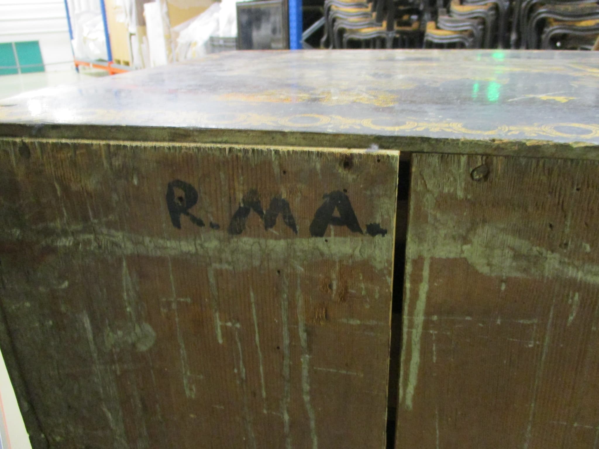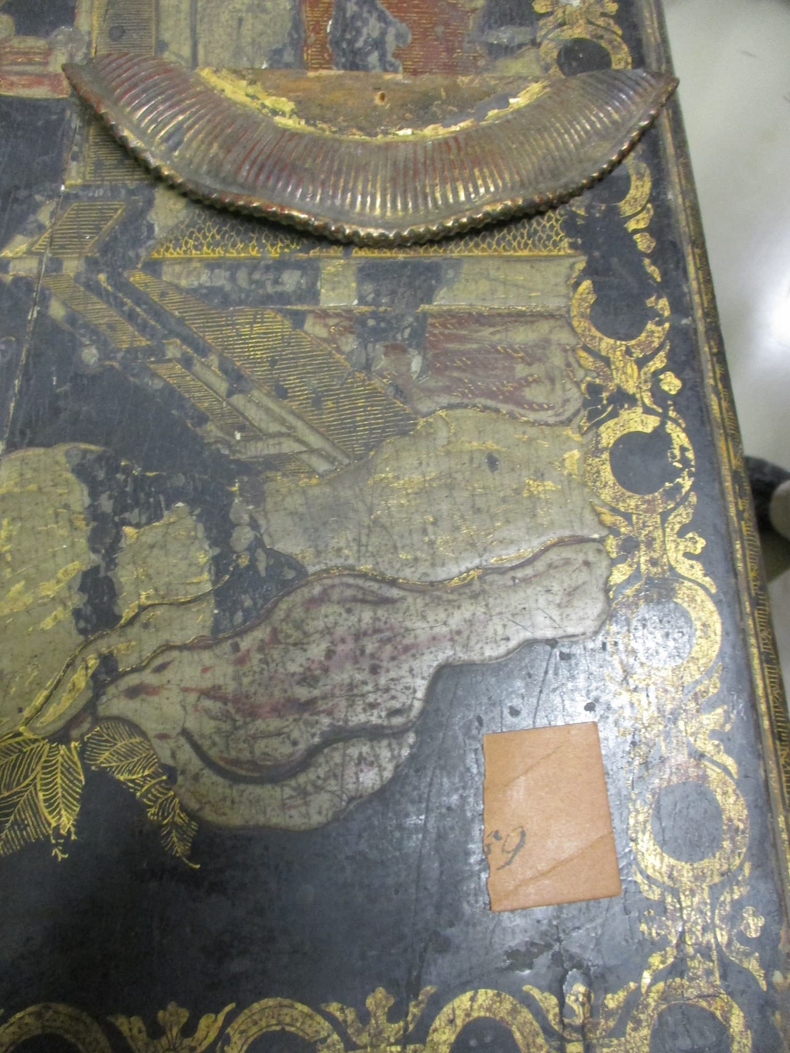 Grande commode en vernis Martin à décor de paysages chinois polychrome sur fond noir, de fleurs sur les côtés et de personnages sur le plateau.