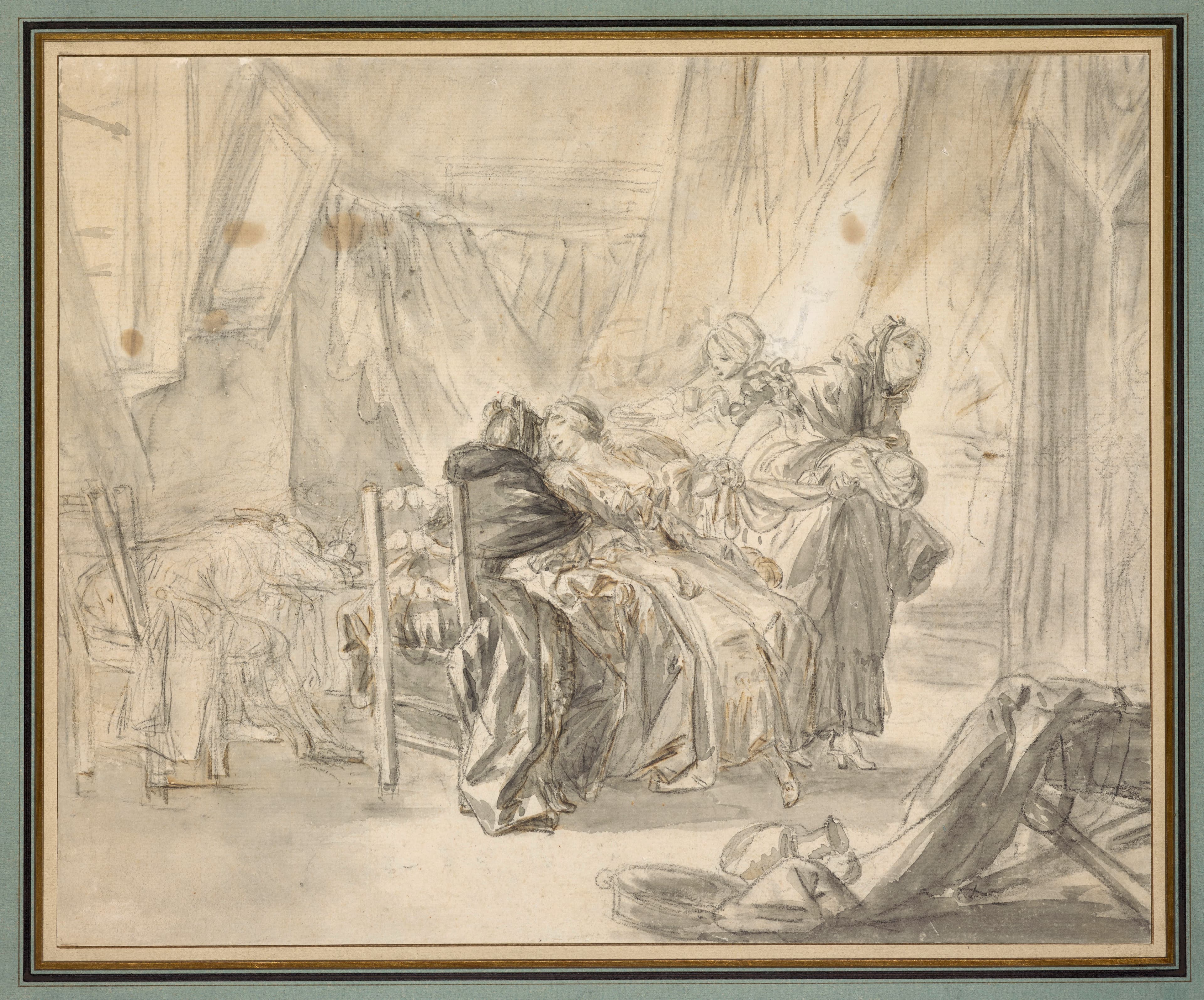 scène (pièce d'habitation, homme, femme, évanouissement, serviteur, désespoir, grossesse, ?)