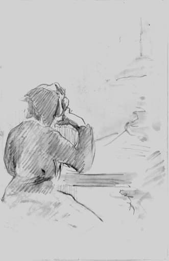 figure (personnage : assis, de dos, accoudé, bâton, table)