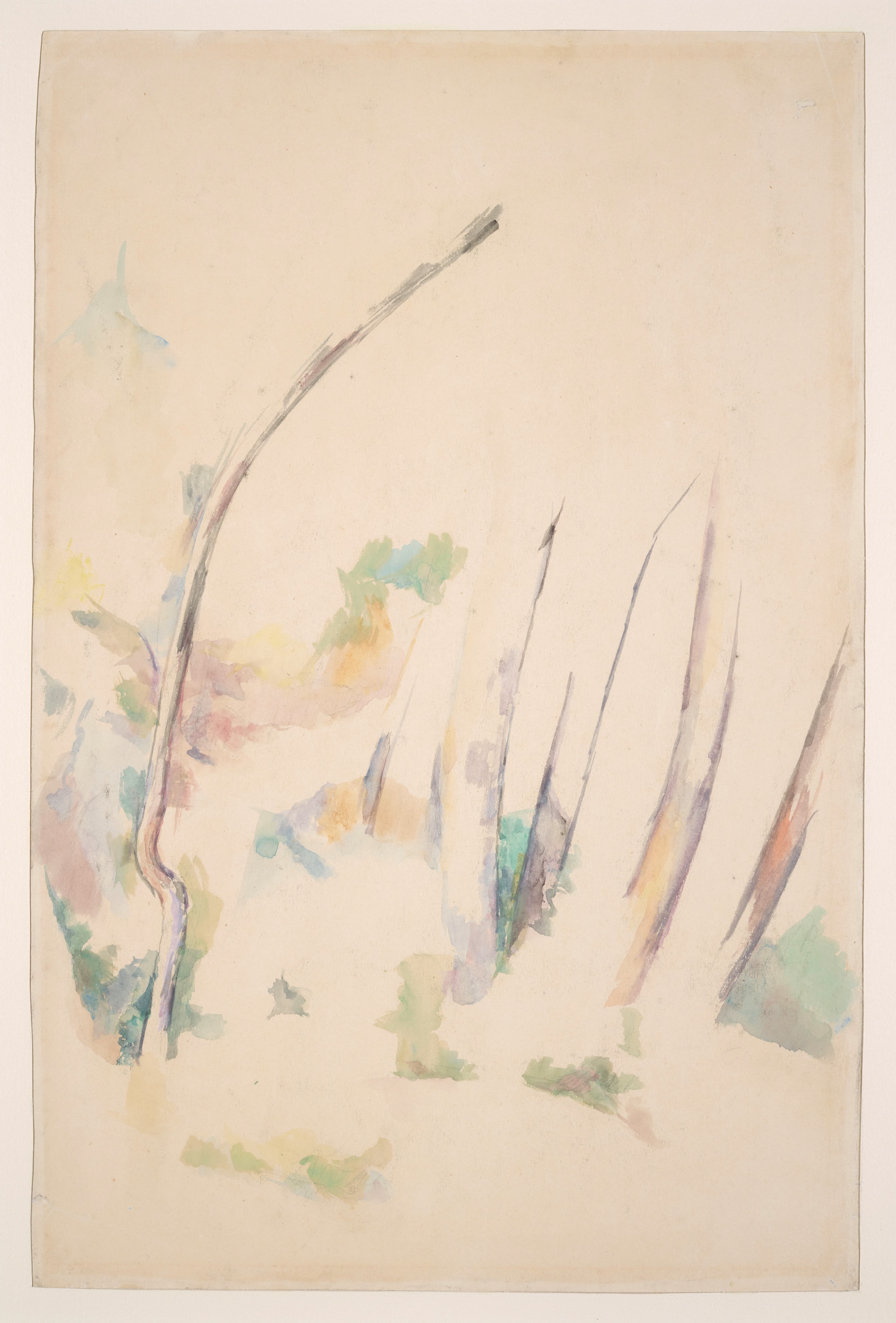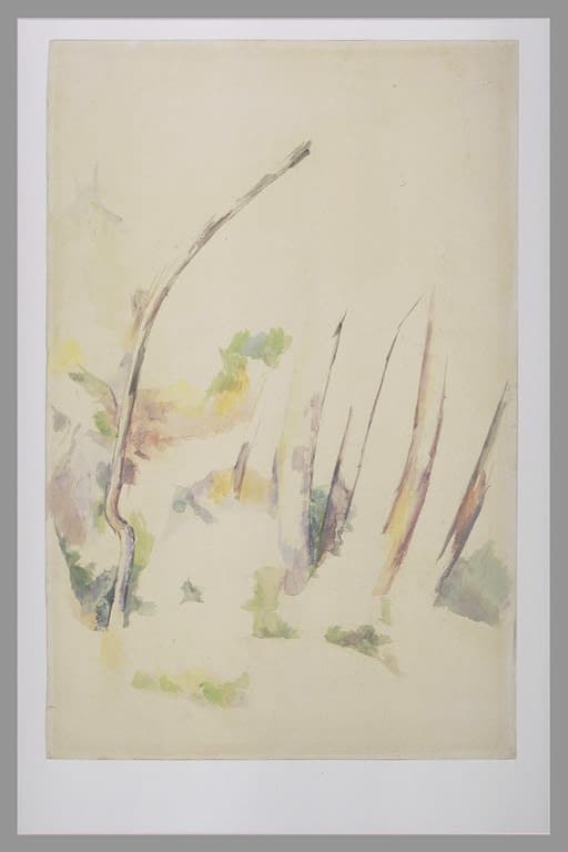 "Cette œuvre se rapproche des compositions telle celle de l'ancienne collection Silberberg de Breslau (Venturi, tome I, n° 982 et Rewald, n° 405), ou celle conservée au Newark Museum (Venturi tome II, numéro 1056 et Rewald numéro 531), où se retrouvent l'arbre coudé situé à droite, et les troncs jaillissant du blanc du papier représentés à gauche. Ces rapprochements permettent de proposer de situer la représentation dans le parc du Château Noir." (D. Lobstein dans le "Petit journal de l'exposition" du Musée d'Orsay en 1994).