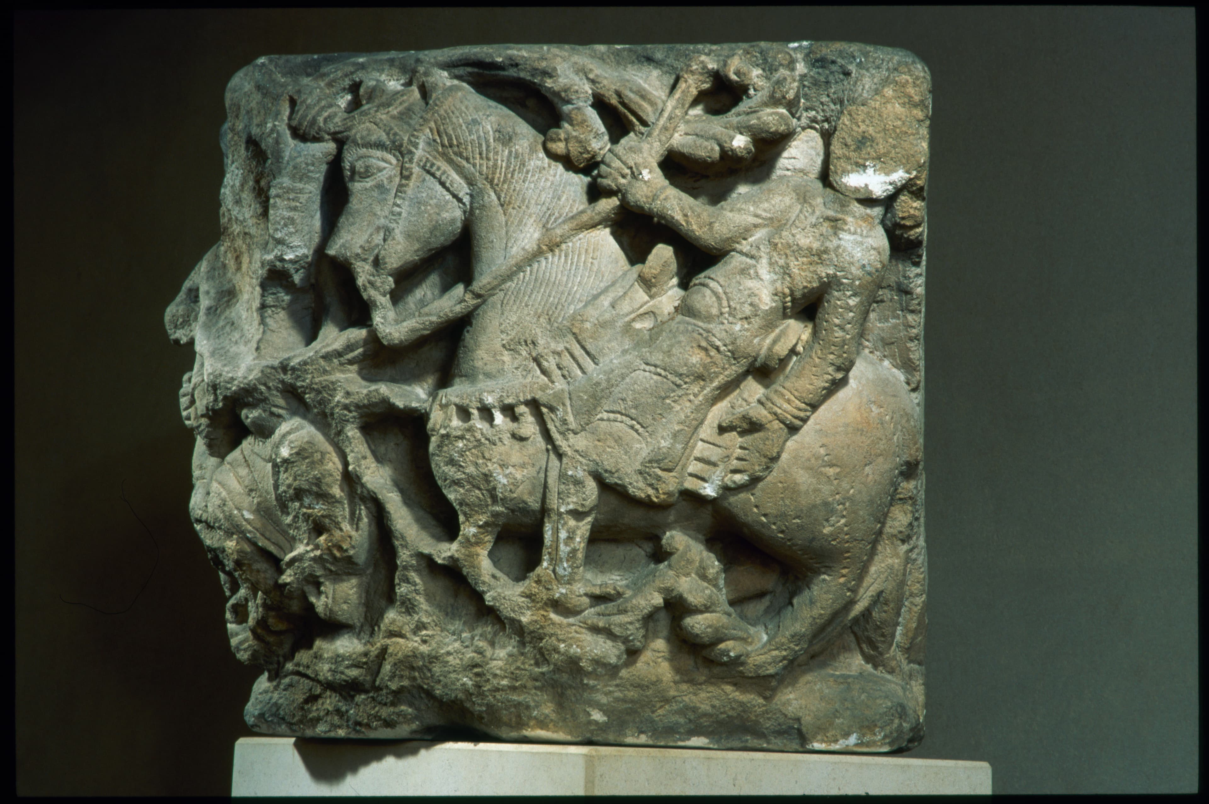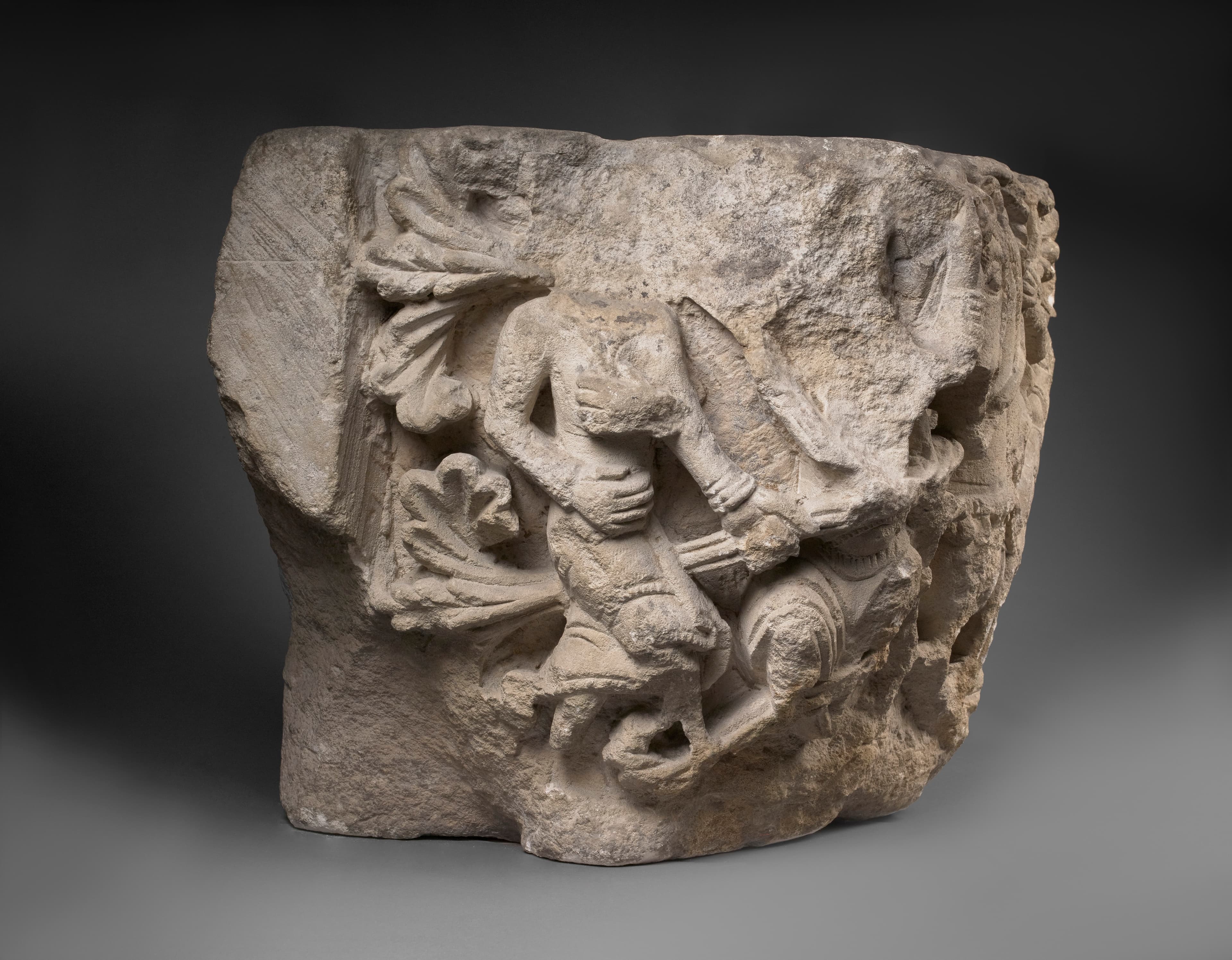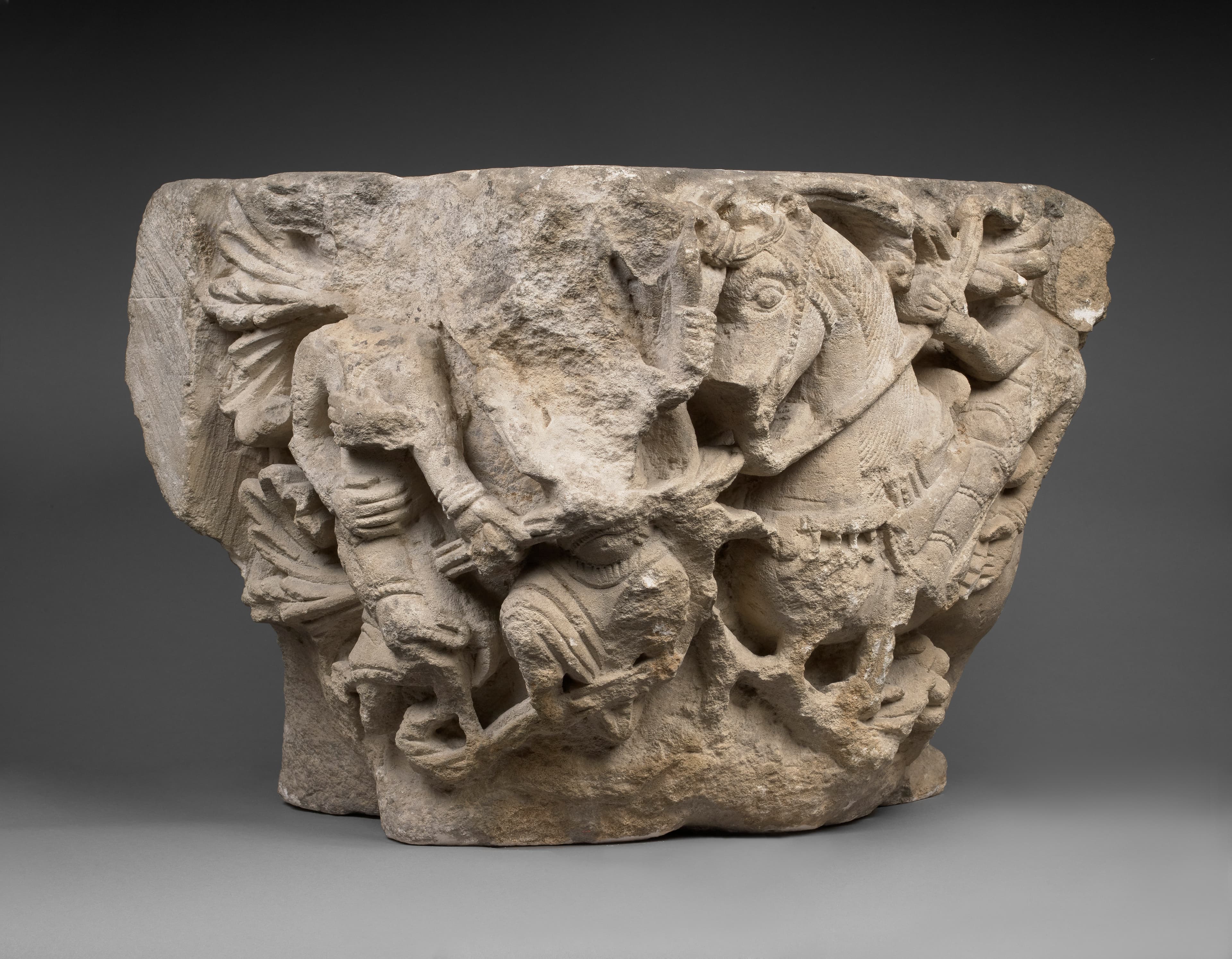 Chapiteau d'angle décoré d'un cavalier et de deux personnages, dans des entrelacs
