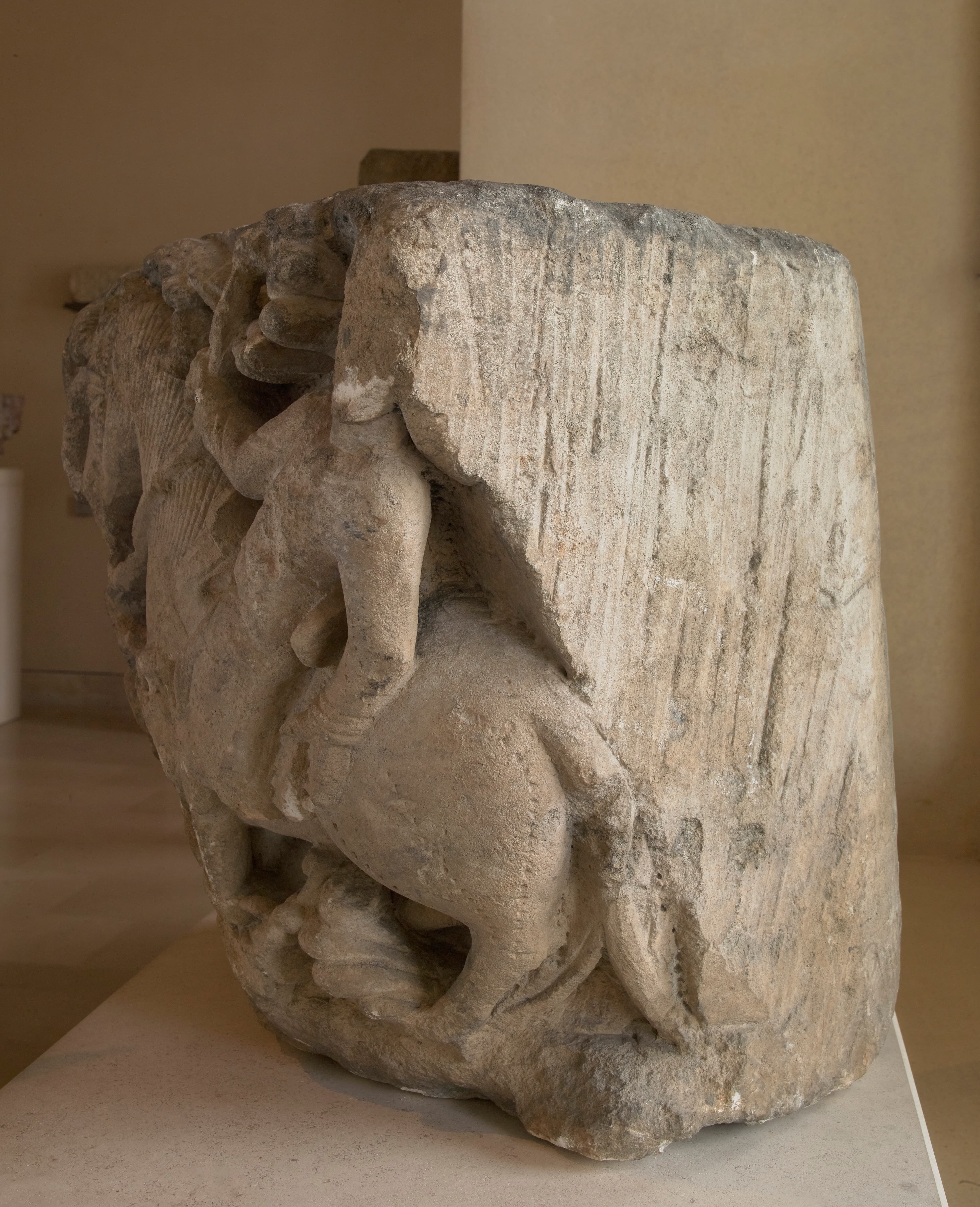 POP | Plateforme ouverte du patrimoineChapiteau d'angle décoré d'un cavalier et de deux personnages, dans des entrelacs
