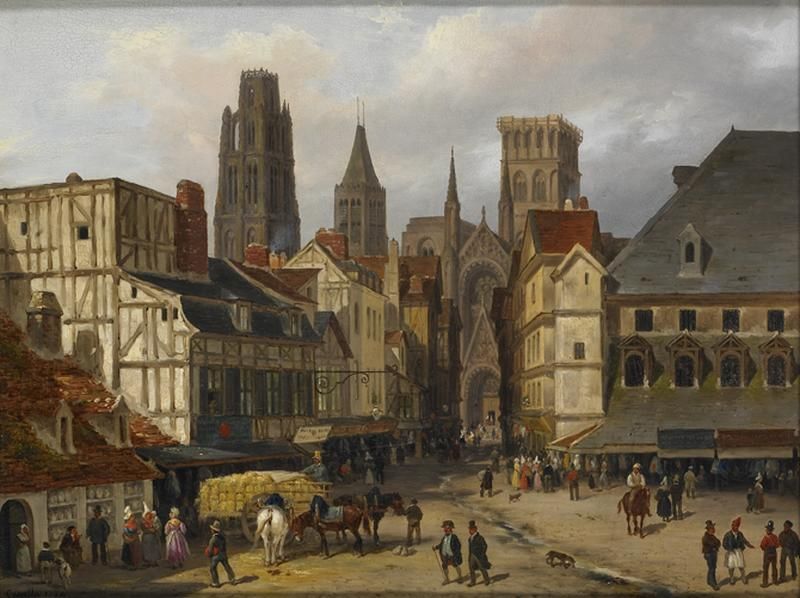 vue d'architecture (foule, place, pan-de-bois, cathédrale, échoppe, Rouen)