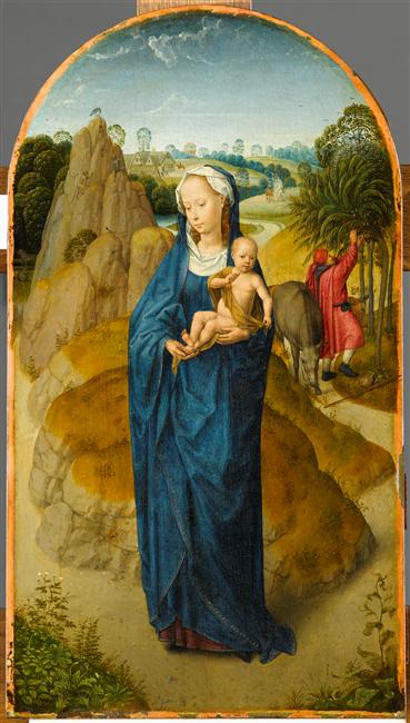 scène biblique (Fuite en Egypte, Vierge à l'Enfant) ; fond de paysage (chemin, saint Joseph, cueillette, âne, rocher)