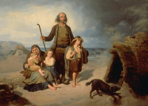 scène historique (séisme, sables mouvants, femme, nourrisson, fillette, garçon, famille, pêcheur, chien, chaumière, homme, bâton : la marche, Escoublac-la-Baule, bord de mer, désespoir)