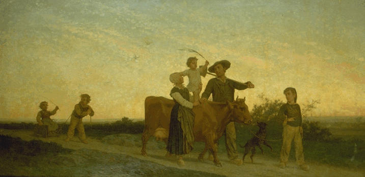 scène (homme, femme, paysan, vache, garçon, fillette, vache, chien, bêche, siège roulant ; crépuscule, bonheur, buisson, maison, chemin)