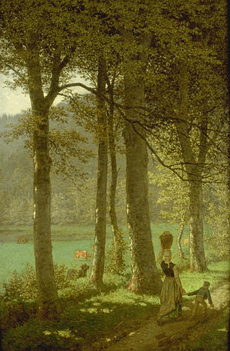 paysage (feuillu, chemin, pré, vache, colline, effet de soleil) ; garçon ; véhicule automobile ; femme ; pot