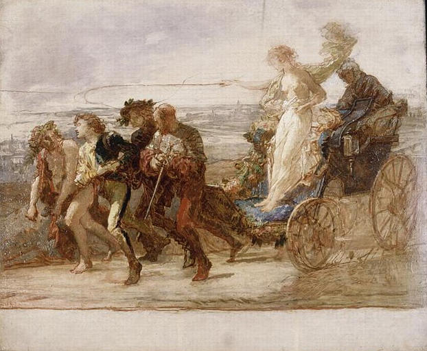 scène (prostituée, fouet, draperie : à l'antique, vieille : famille, voiture découverte : homme, satyre, symbole : orgueil, chanteur : poésie, symbole : attente : étudiant, couronne : laurier, soldat : vieux, épée, symbole : défaite) ; fond de paysage (Seine, Paris)