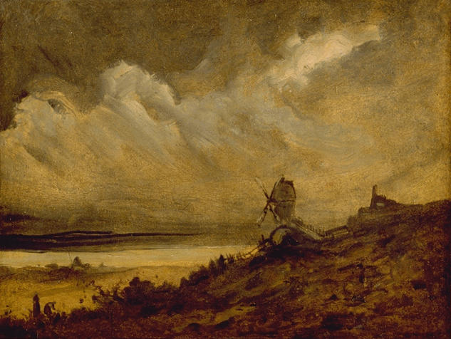 paysage (colline, moulin à vent, rivière, nuage) ; personnage