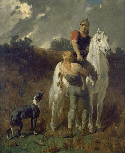 scène (cavalier, casque, homme, Gaulois, chasseur, chien, arc, loup : cadavre, don, feuillu, nuage)