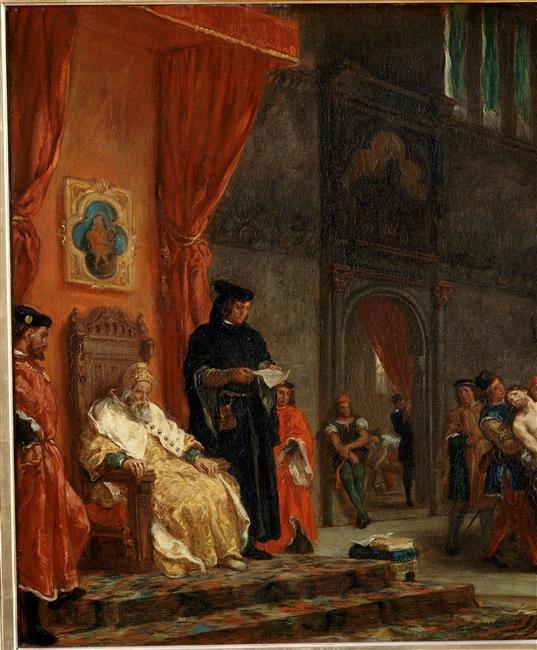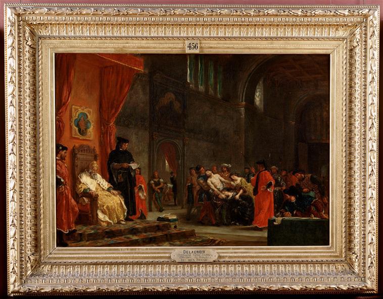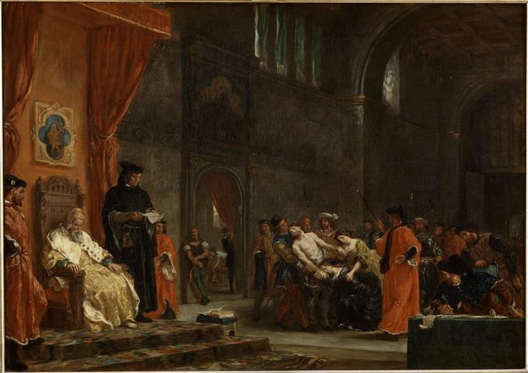 scène historique (Foscari Francesco, souverain : Venise, torture, sentence, Foscari Jacopo, désespoir) ; vue d'intérieur (palais, salle, foule)