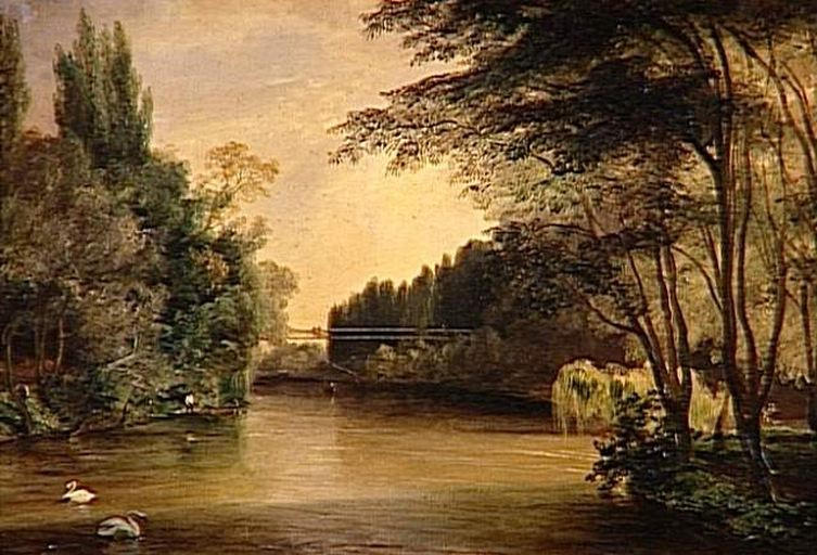 paysage (cours d'eau, passerelle, Neuilly-sur-Seine, feuillu) ; cygne