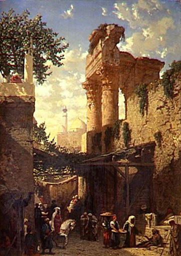vue d'architecture (rue, colonne, Le Caire) ; scène (à l'orientale, charité, mendicité)