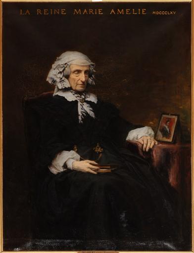 portrait (rétrospectif, Marie-Amélie de Bourbon : reine de France, femme, de trois-quarts, assis, veuf, deuil, coiffe, livre, bijou, peinture) ; peinture (portrait, Louis-Philippe Ier)