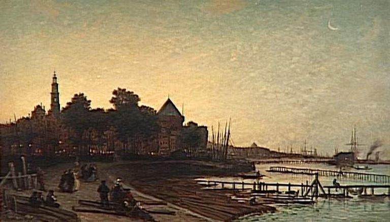 vue d'architecture (Amsterdam, ville, port, Hollande, crépuscule, éclairage, Amstel, bois, flottage, église, tour, personnage)
