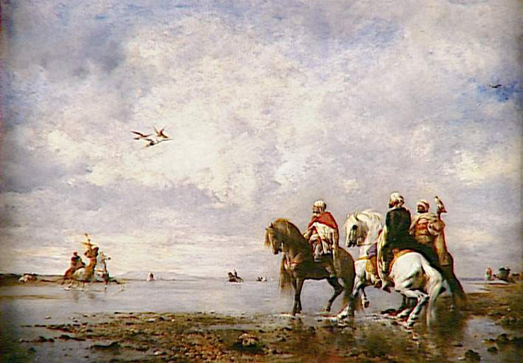 scène (chasse au faucon, Algérie, homme : Arabe, vêtement, cheval, plaine, marais, héron, faucon, agression animale, nuage, Algérie)