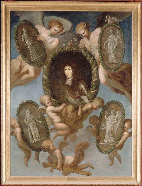portrait (Condé prince de, en médaillon, allégorie, homme, en buste, de trois-quarts) ; figure mythologique (Athéna, en médaillon, en pied, de trois-quarts, relief, attribut : casque, lance) ; figure (allégorie : force, en médaillon, femme, en pied, de trois-quarts, relief, attribut : massue) ; figure (allégorie : renommée, en médaillon, femme, en pied, de trois-quarts, relief, attribut : couronne, palme) ; figure (allégorie : justice, en médaillon, femme, en pied, de trois-quarts, relief, attribut : balance) ; ange (épée, symbole : victoire)