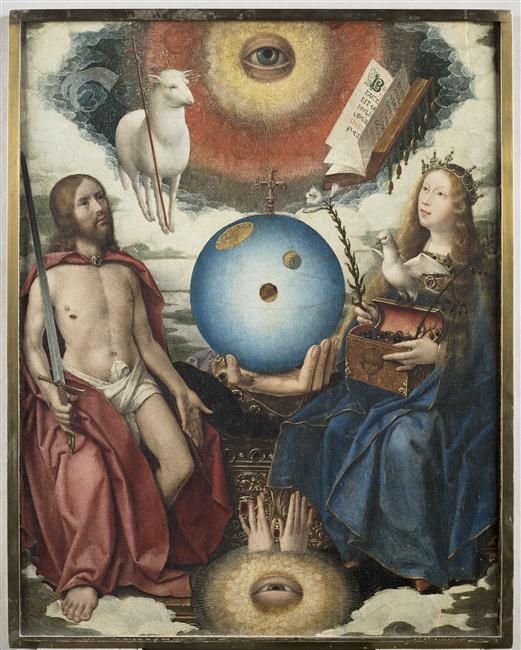 figures bibliques (allégorie, l'Eglise, Christ juge, boîte, Vierge, Saint-Esprit : colombe, agneau mystique, livre, lys, globe, Dieu le père : main, oeil)