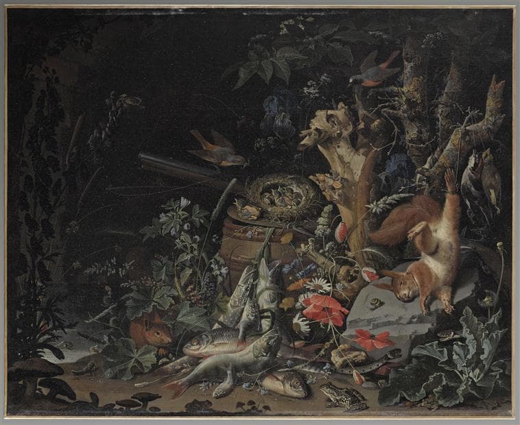 POP | Plateforme ouverte du patrimoineLE NID DE ROUGES-QUEUES A FRONT NOIR. POISSONS, REPTILES ET ECUREUIL MORT AU MILIEU DE PLANTES ET D'ARBRES