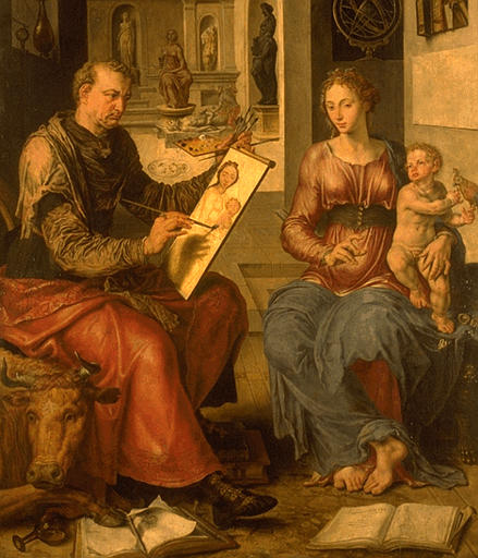 scène biblique (saint Luc, art de la peinture, Vierge à l'Enfant, perroquet, boeuf de saint Luc, livre) ; vue d'intérieur (atelier, sculpteur)
