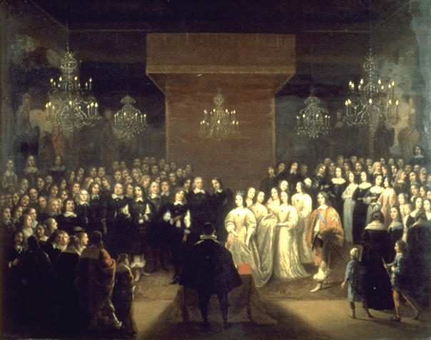 scène historique (mariage, Orange Louise Henriette d', Brandebourg Frédéric Guillaume de, debout, homme, femme, noblesse, château : intérieur, tapisserie, lustre)