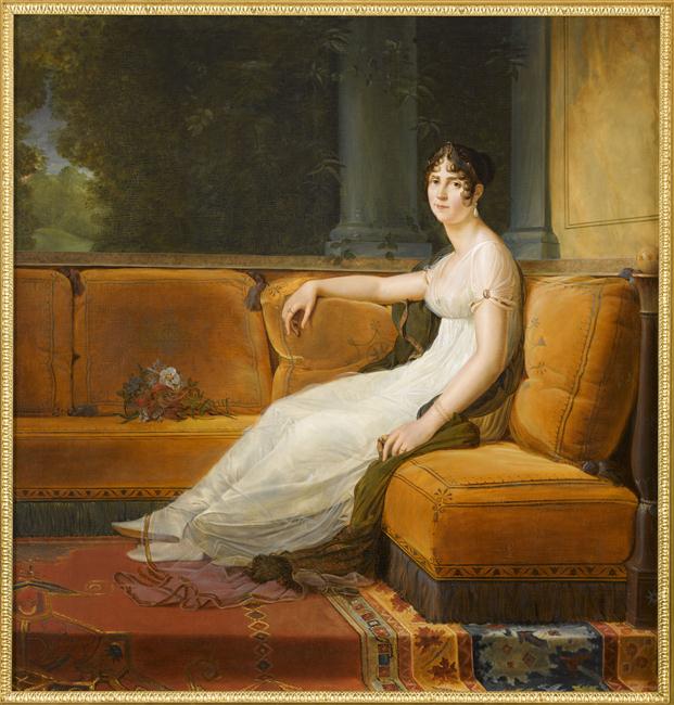 portrait (Joséphine, impératrice, femme, assis, de trois-quarts, canapé, bouquet, fleur, colonne, tapis)