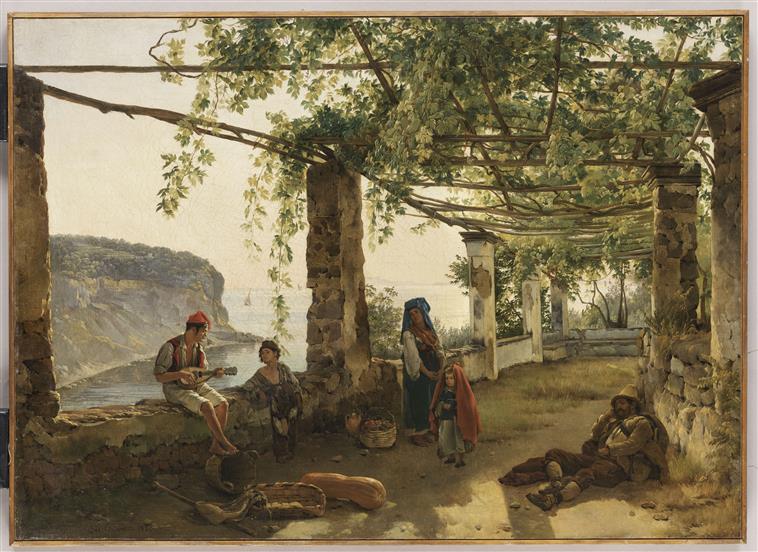scène (Sorrente, terrasse, vigne, bord de mer, Méditerranée, personnage, musique, mandoline)