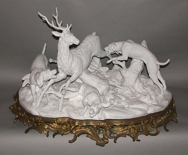 ce surtout a été commandé au sculpteur Pierre Blondeau et mis en fabrication en 1776 d'après les projets fournis antérieurement par Jean-Baptiste Oudry. L'influence persistante d'Oudry sur la porcelaine de Sèvres est notoire. Indépendamment, les chasses d'Oudry, suite de tapisseries tissées aux Gobelins sous le règne de Louis XV, furent peintes entre 1779 et 1781 sur plaques de porcelaine. Livré, sur l'ordre verbal du roi, à S.A.R. Mgr le duc d'Aumale, pour le château de Chantilly, le 10 mai 1847, (Arch. M.N.S. Vbb fo16) valeur totale 3.450 fr