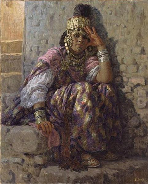 portrait (femme, vêtement : à l'orientale, assis, accoudé, de trois-quarts, bijou, Algérien,?)