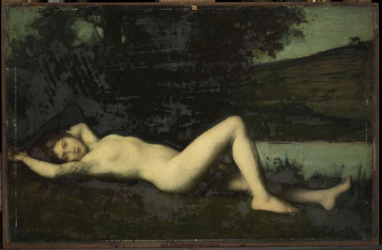 figure (naïade, couché, femme:nu, repos, lac, feuillu)
