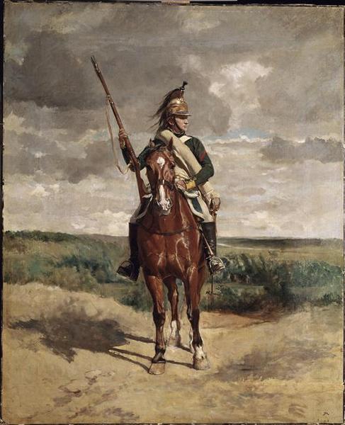 figure (homme, équestre, de trois-quarts, officier : cavalerie, casque, épée, cheval)