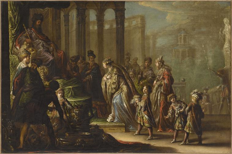 scène biblique (présentation, Esther, Assuérus, trône, sceptre, homme, femme, serviteur : enfant, soldat, portique, fabrique de jardin)