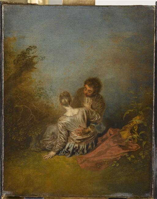 scène (galanterie, étreinte, couple, femme, assis, de dos) ; fond de paysage