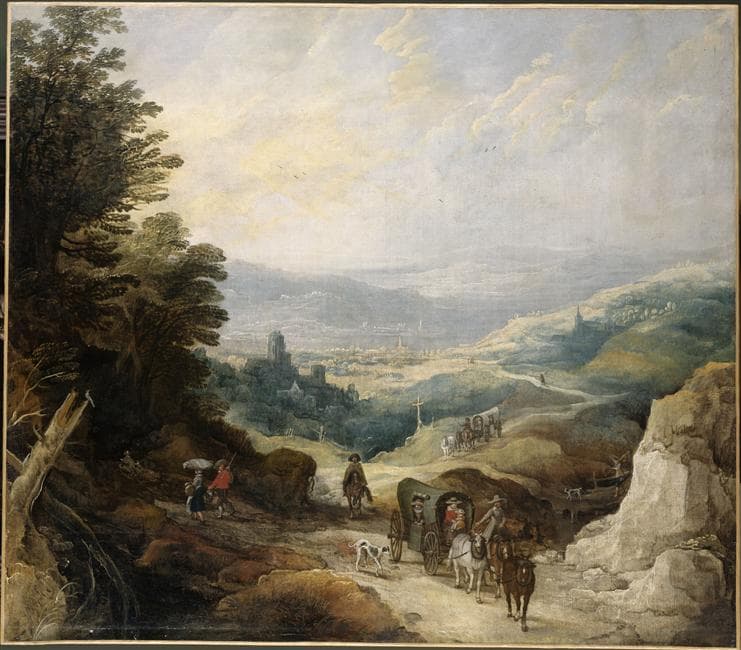 Paysage montagneux ; Paysage montagneux avec deux coches et un cavalier