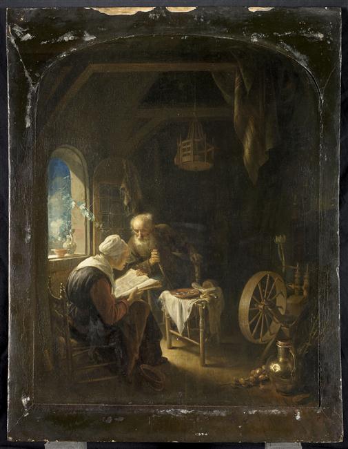 scène biblique (intérieur, Tobie, ?, sainte Anne, ?, vieux, vieille, couple, lecture, livre : Bible, Judaïsme, fenêtre, intérieur, rouet, pot)