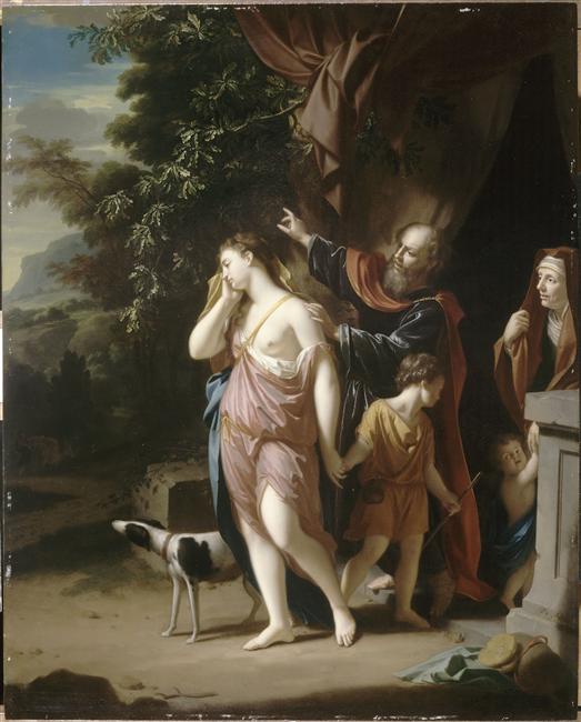 scène biblique (Abraham, Agar, Ismaël, départ, nudité, tristesse, chien, feuillu)