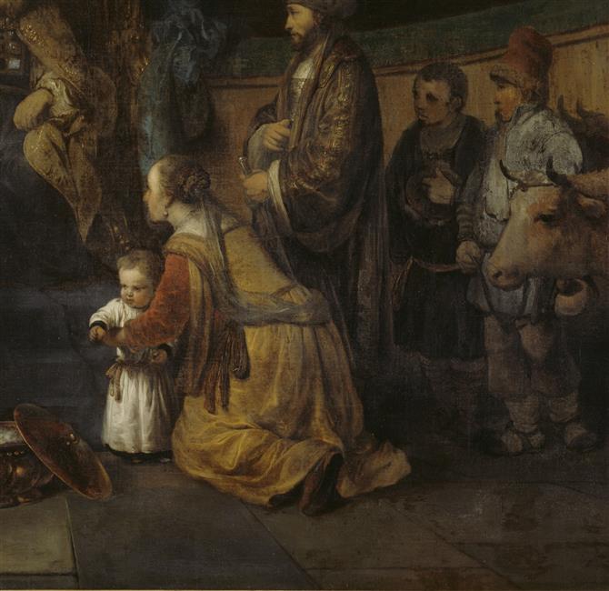 scène biblique (Elie, trône, Anne mère de Samuel, présentation, Samuel : enfant, livre, Elqana, boeuf, élément d'architecture)