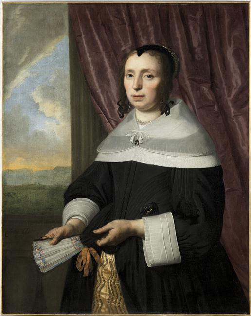 portrait d'inconnu (femme, à mi-corps, de trois-quarts, col, coiffe, éventail, tenture) ; fond de paysage
