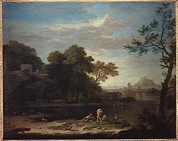 paysage (cours d'eau, montagne, feuillu, personnage, baignade)