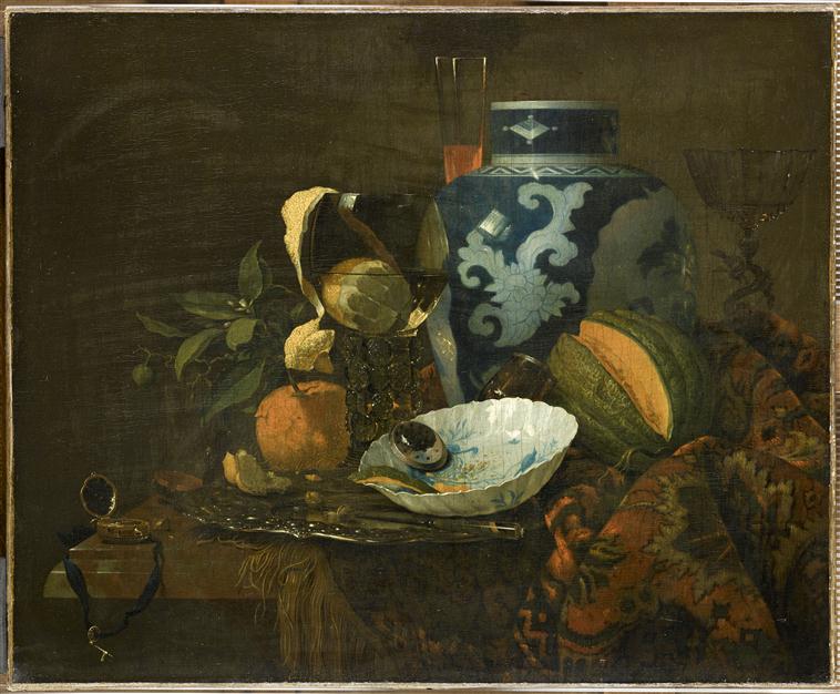 nature morte (vase : céramique, fruit, verre à pied : verrerie, vaisselle, melon, tapis)