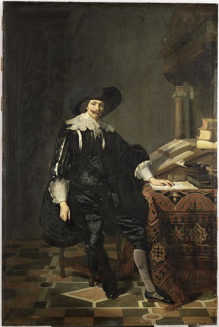 portrait d'inconnu (homme, assis, de trois-quarts, dentelle, chapeau, table, tapis, livre, pupitre, pavement)